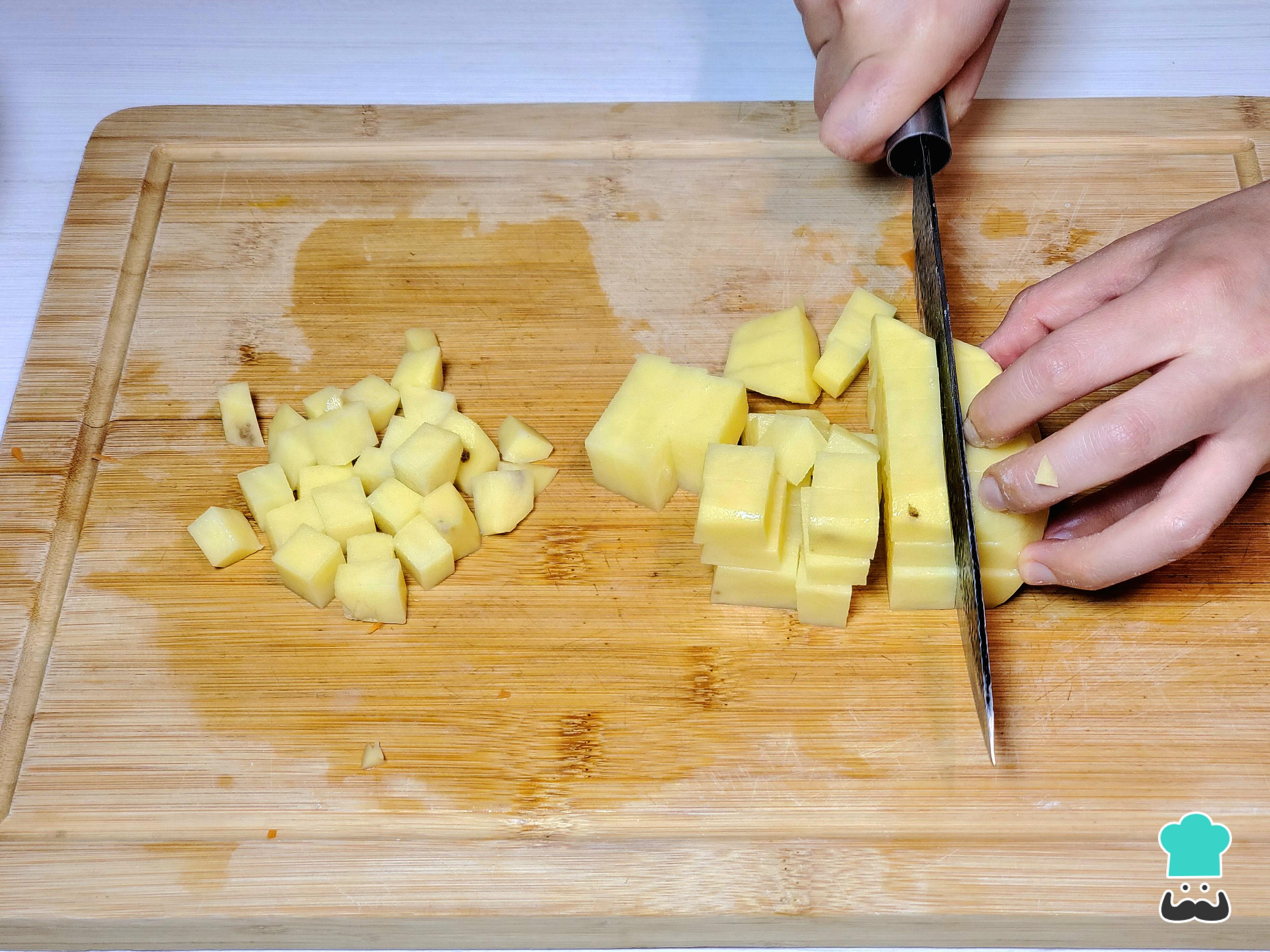 Para hacer la ensalada blanca, comienza cortando todos los ingredientes. Corta las zanahorias y las papas en cubos regulares de aproximadamente un dedo de grosor. También corta los duraznos enlatados y el jamón en trozos del mismo tamaño o ligeramente más grandes.