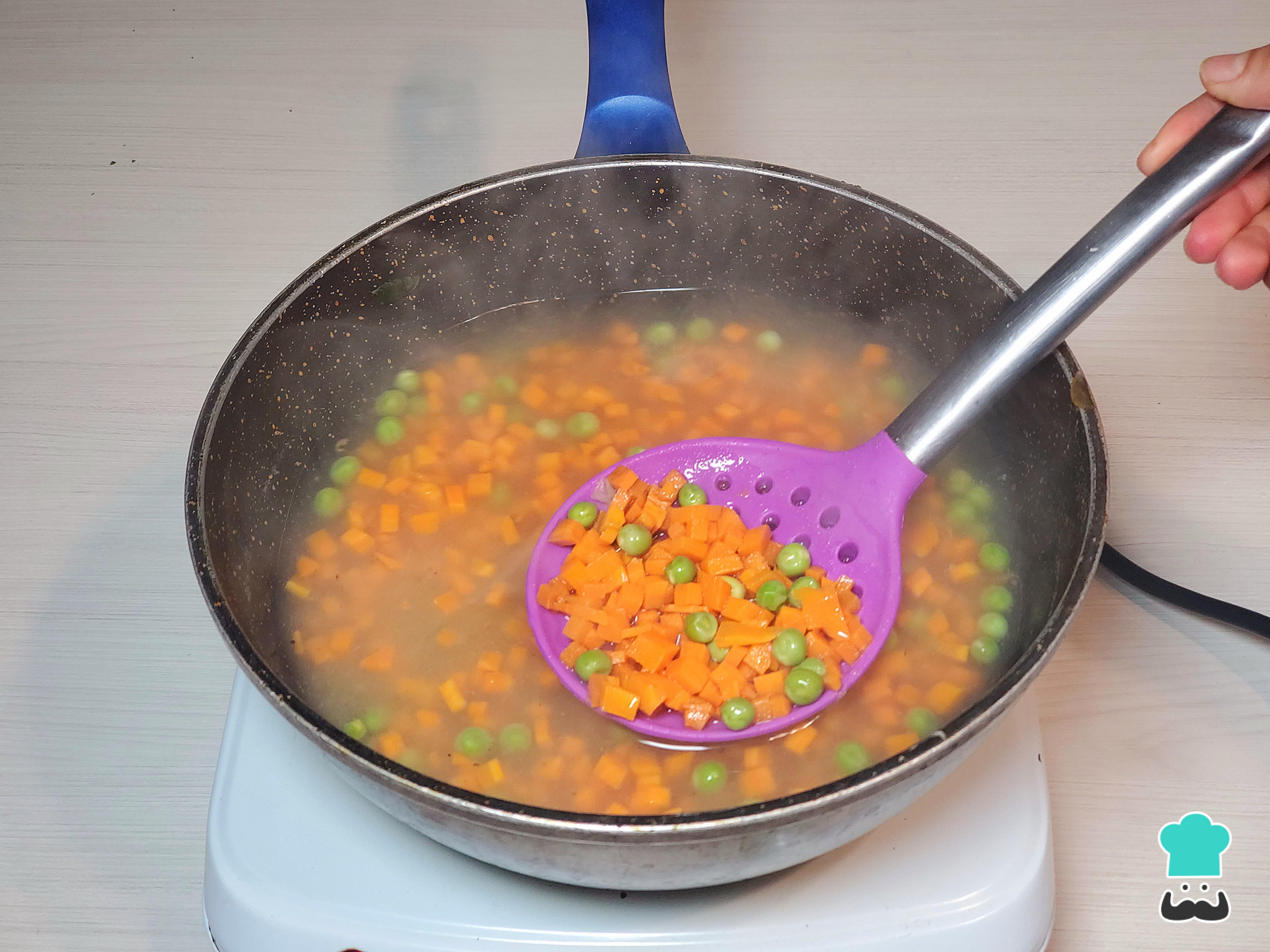 Pon a calentar una olla con abundante agua y blanquea las papas, las zanahorias y las alverjitas por separado, ya que tienen distintos tiempos de cocción. Recuerda pasar las alverjitas por agua helada para que mantengan su color brillante.