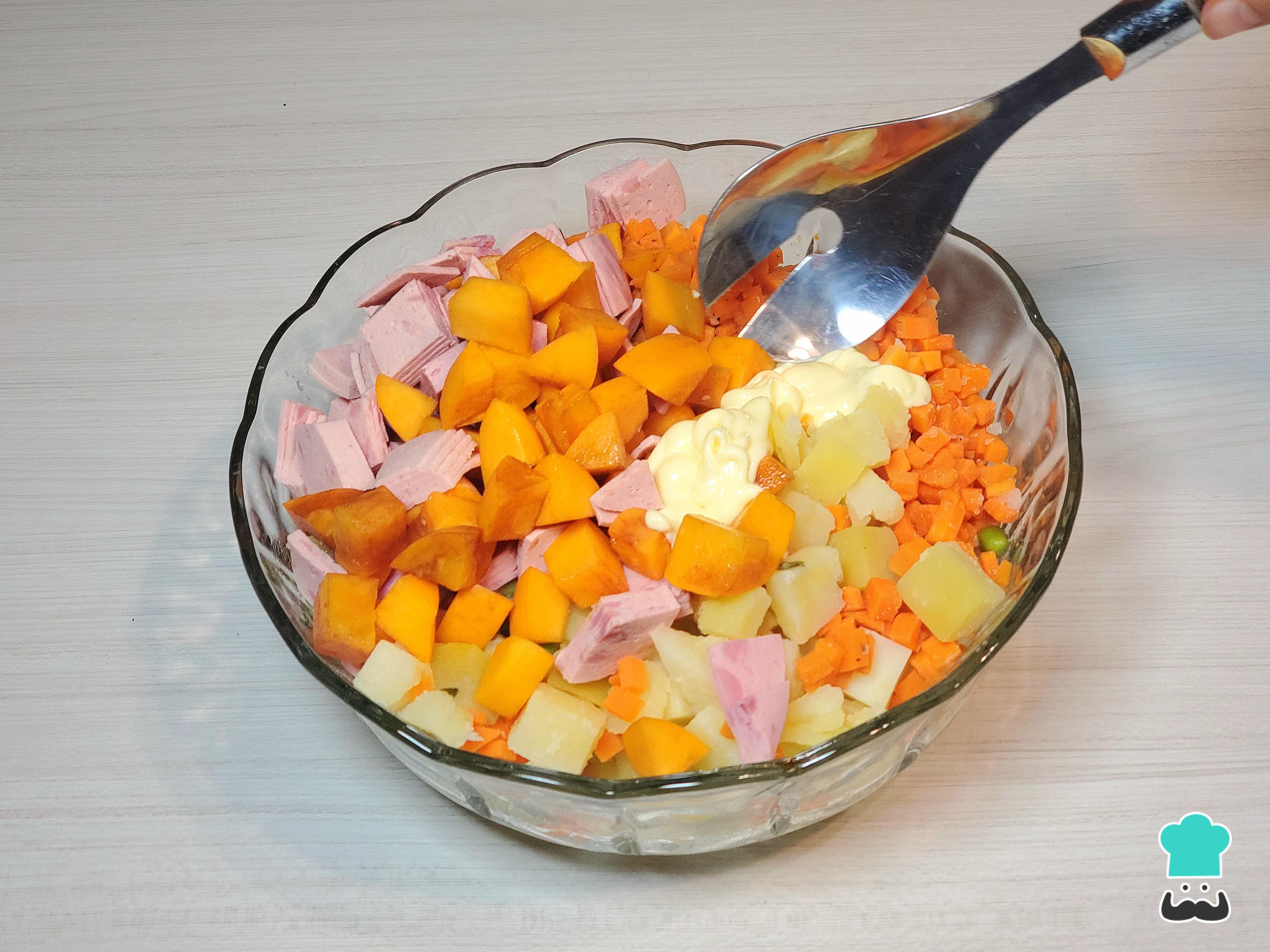 Coloca todos los ingredientes en un bowl de ensalada y vierte la mayonesa. Remueve bien, agrega sal al gusto y termina la ensalada con perejil finamente picado.