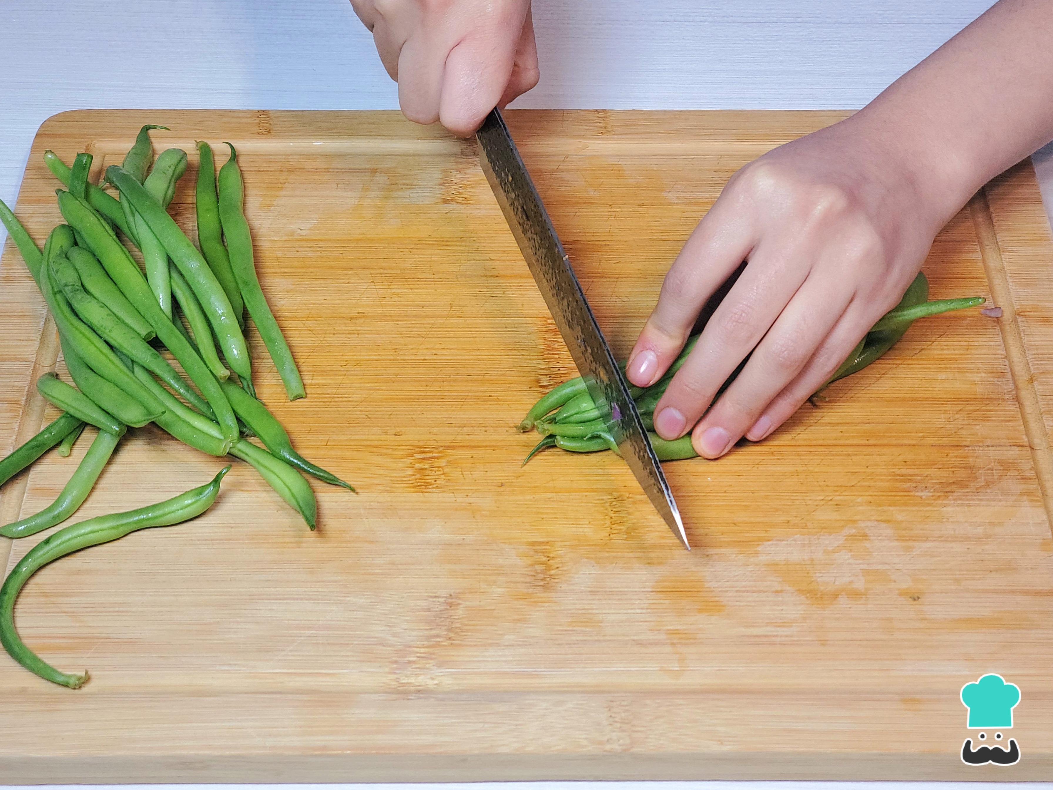 Aparte, corta una zanahoria en bastones grandes y retira los extremos de las vainitas. Estos dos ingredientes irán como decoración en el centro de la pieza de res.