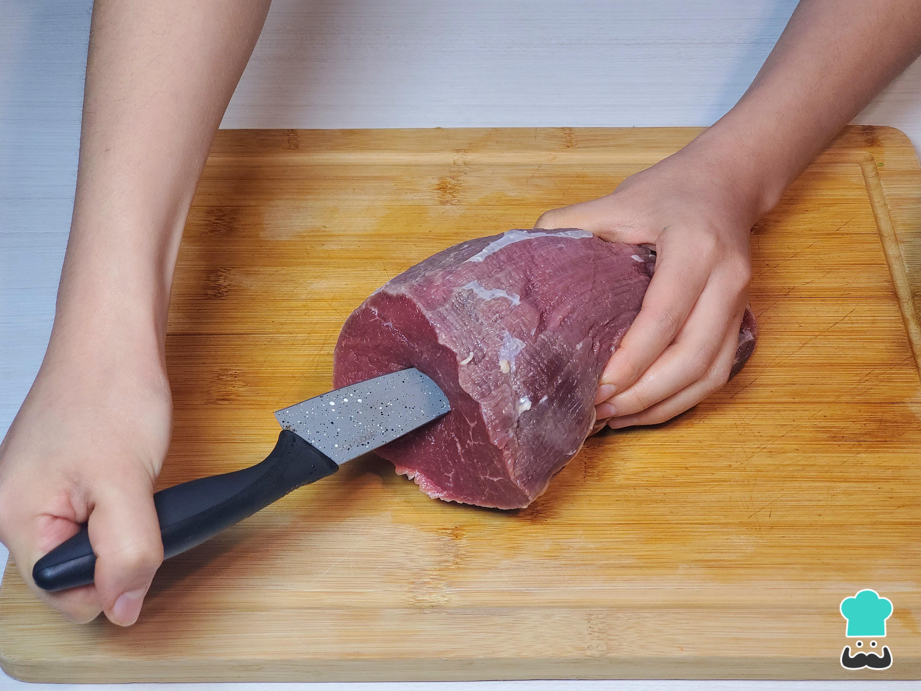 En otra tabla, coloca el medallón de carne, salpiméntalo y, con la ayuda de un cuchillo pequeño, realiza una incisión en el centro.