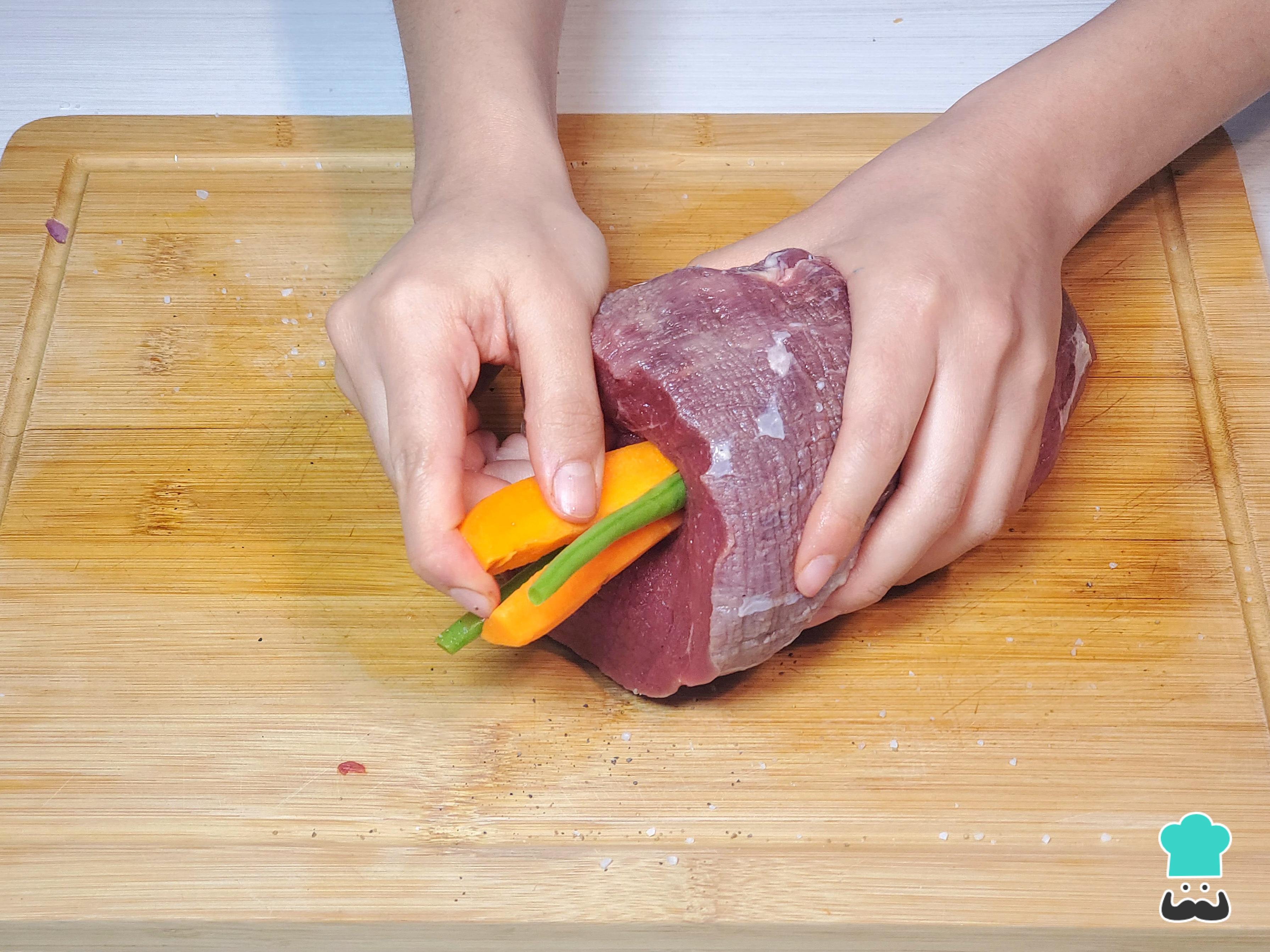 Inserta las zanahorias y las vainitas en la incisión. Este paso es opcional, pero le dará un toque especial a tu buffet navideño.
