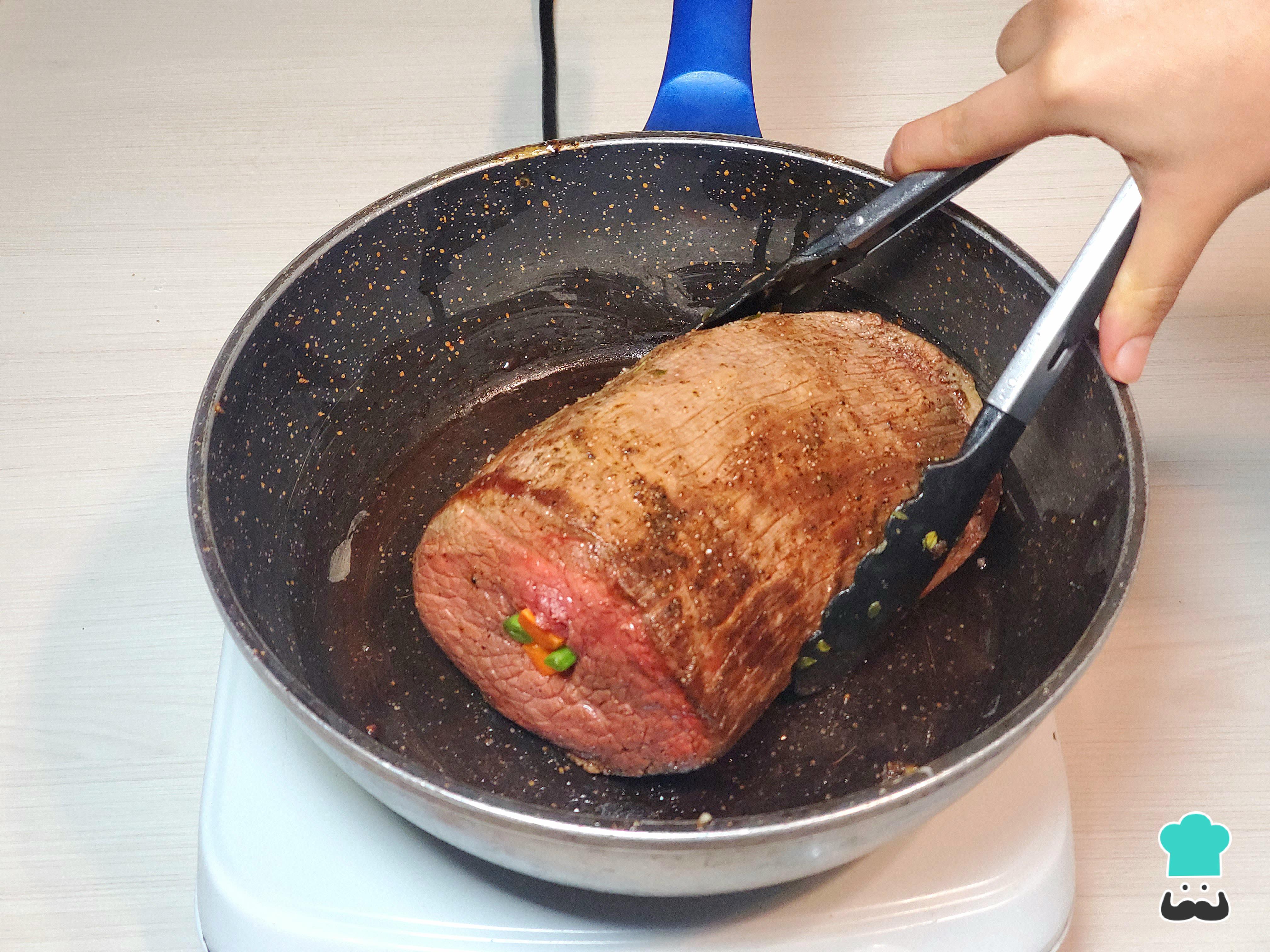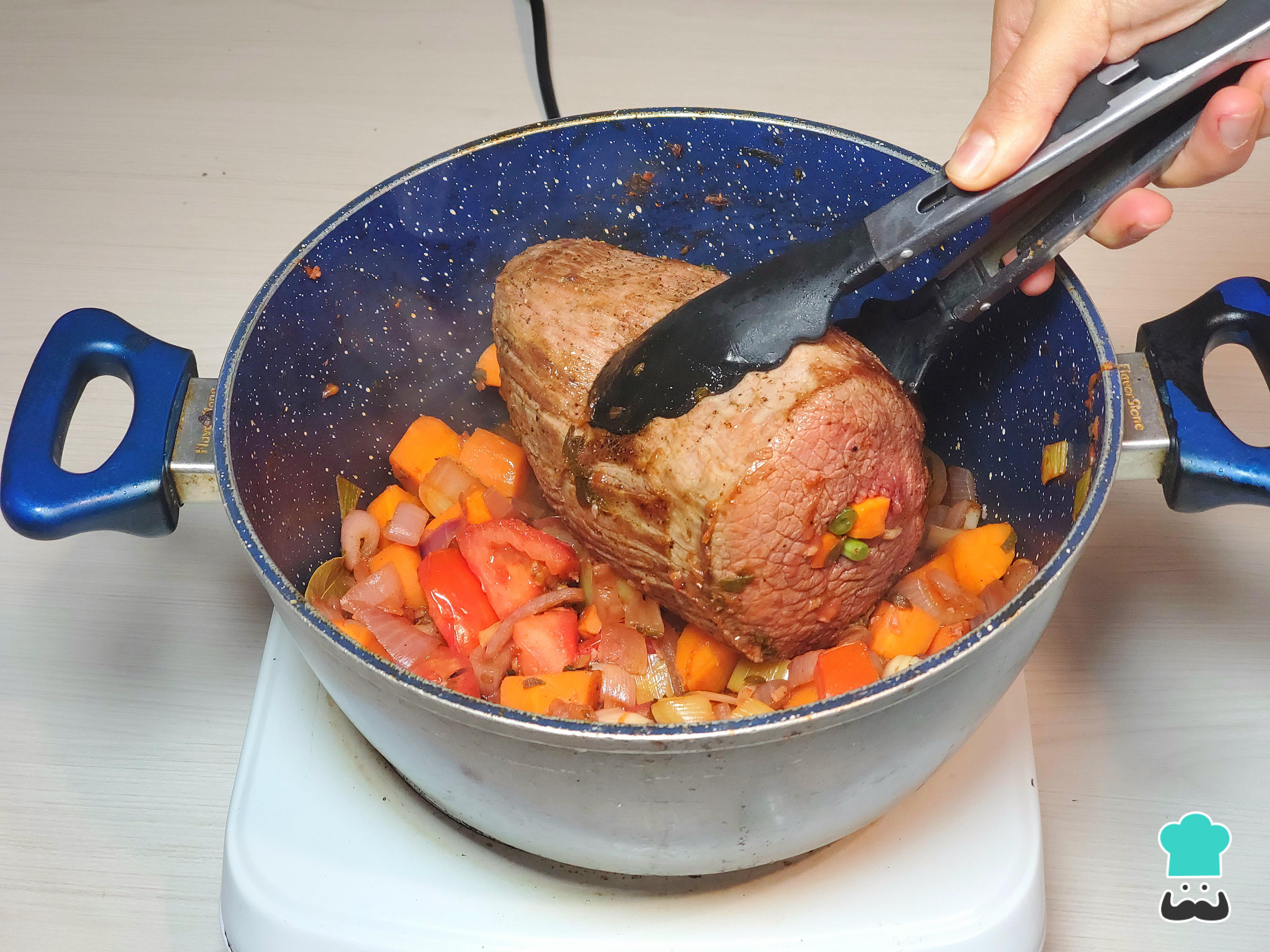 Calienta una olla grande y añade un buen chorro de aceite. Cuando el aceite empiece a humear, coloca cuidadosamente el trozo de carne y séllalo por todos los lados. Luego, resérvalo.