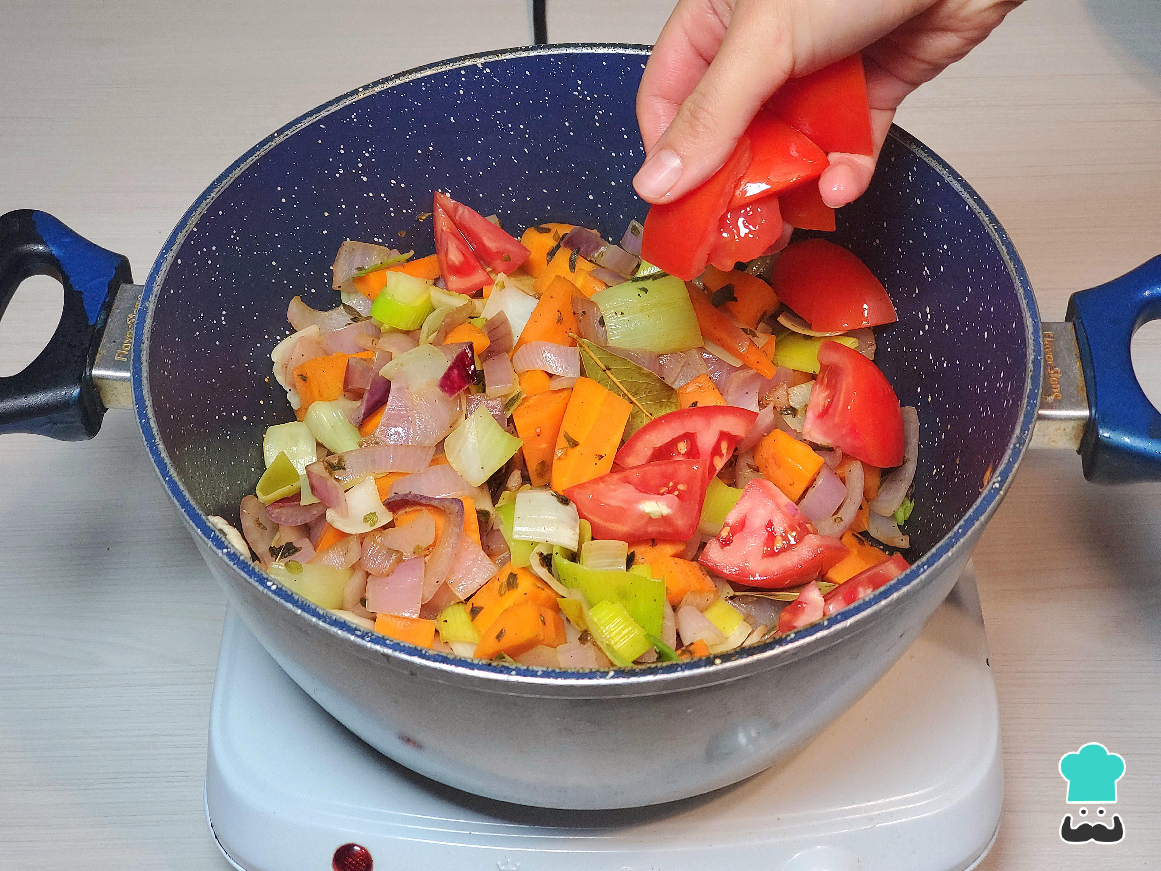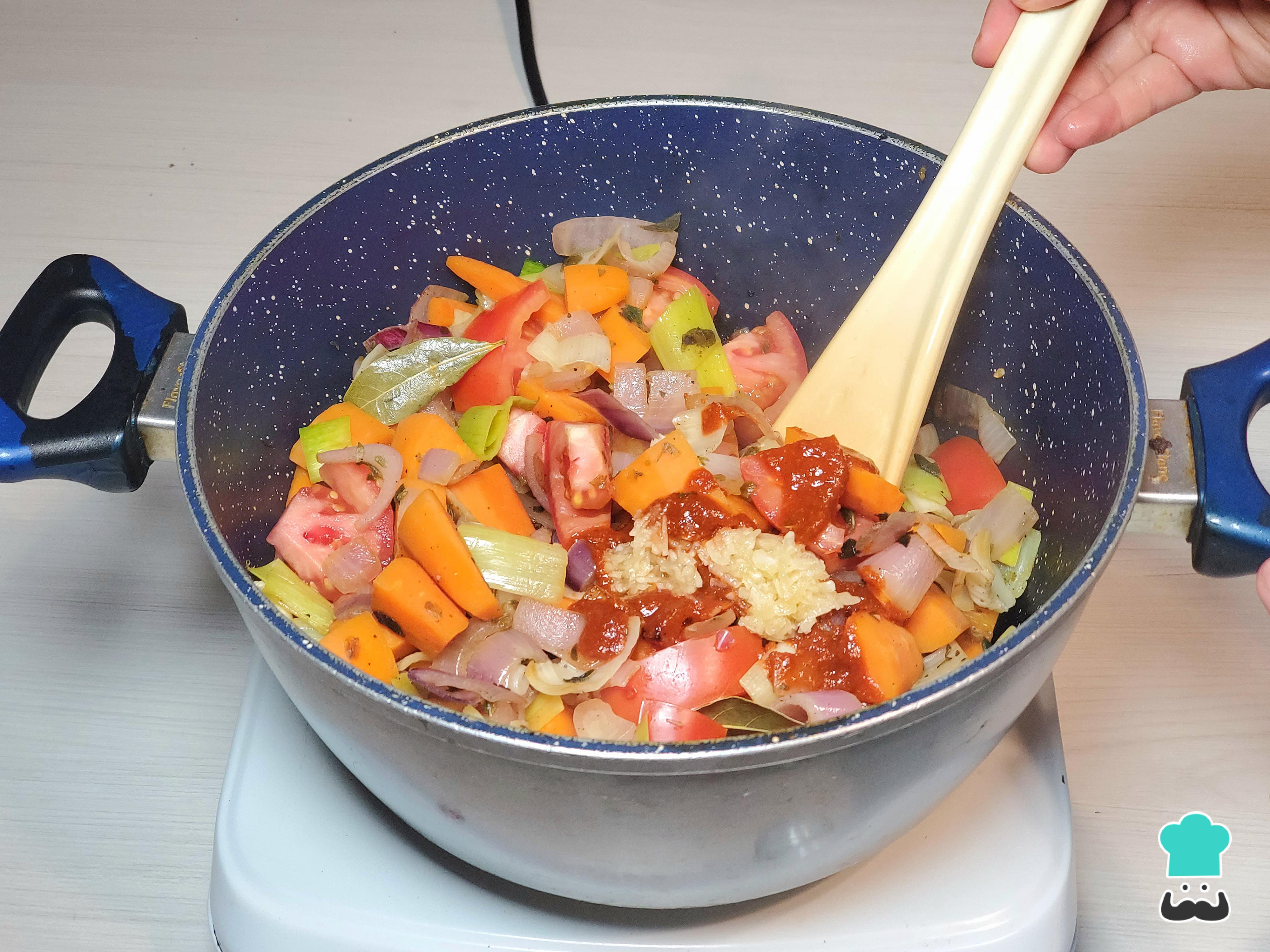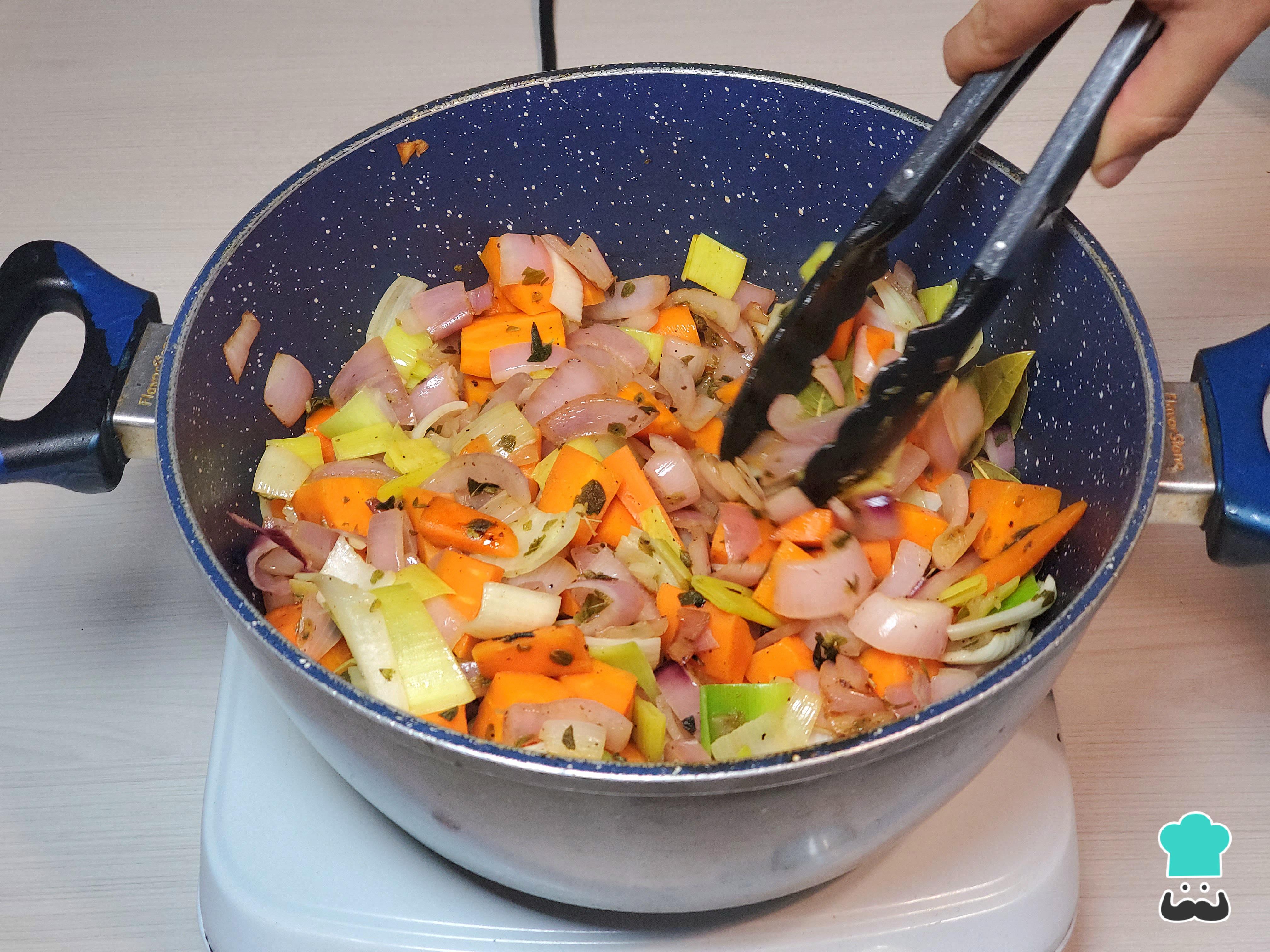 En la misma olla, vierte un buen chorro de aceite de oliva y añade la cebolla, el poro, la zanahoria y los dientes de ajo. Remueve por un par de minutos hasta que empiecen a dorarse ligeramente. En este momento, puedes aromatizar con hierbas como hojas de laurel, orégano y una pizca de tomillo.