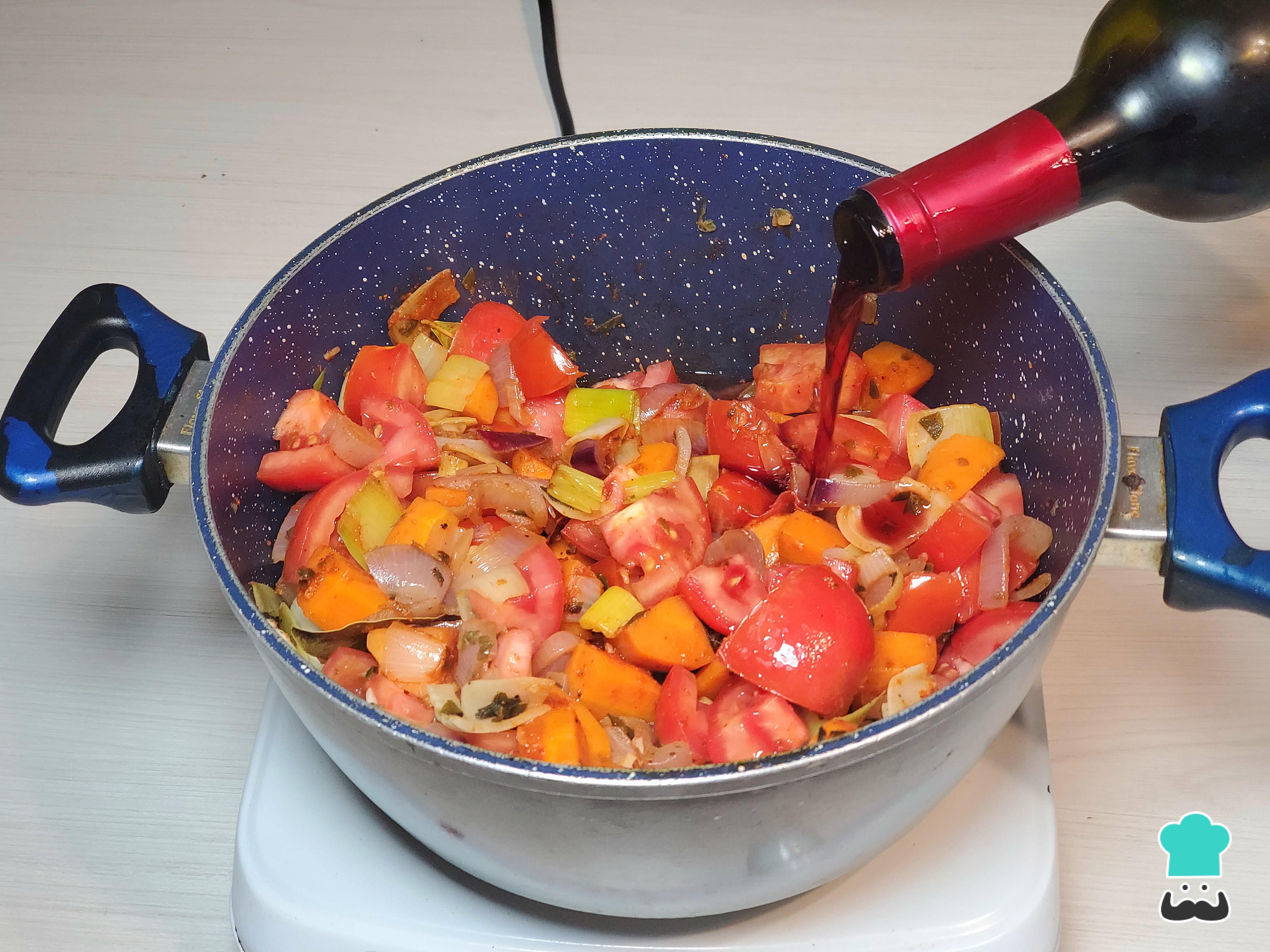 Por último, vierte el vino tinto, remueve y deja que hierva para que se evapore el alcohol.