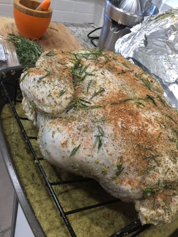 Es una Buena receta de pavo, pero no es la auténtica receta para el día de acción de gracias {Thanksgiving}. La receta americana no lleva carne de ningún tipo. Generalmente el “stuffing “ se hace con pan de maíz 🌽 los jugos que salen del pavo una vez horneado y antes de dorarlo, así como algunas legumbres a gusto de los comensales…Se hace un “gravy” o salsa con la otra parte de los jugos y grasa que suelta el pavo después que esta horneado y este gravy se le adiciona champiñones y vino para acentuarles el sabor. Generalmente se envuelve en papel aluminio para cocinarlo en el horno pero luego cuando ya está cocinado se destapa se le pone el “stuffing” y se pone nuevamente al horno para dorarlo y que tome un buen color de unos 15-25 minutos a 375 grados o 180-190 centígrados. Se sirve co pure de papas y con salsa de arándanos….. that’s an authentic recipe …some people use just Italian herbs and don’t the stuffing…