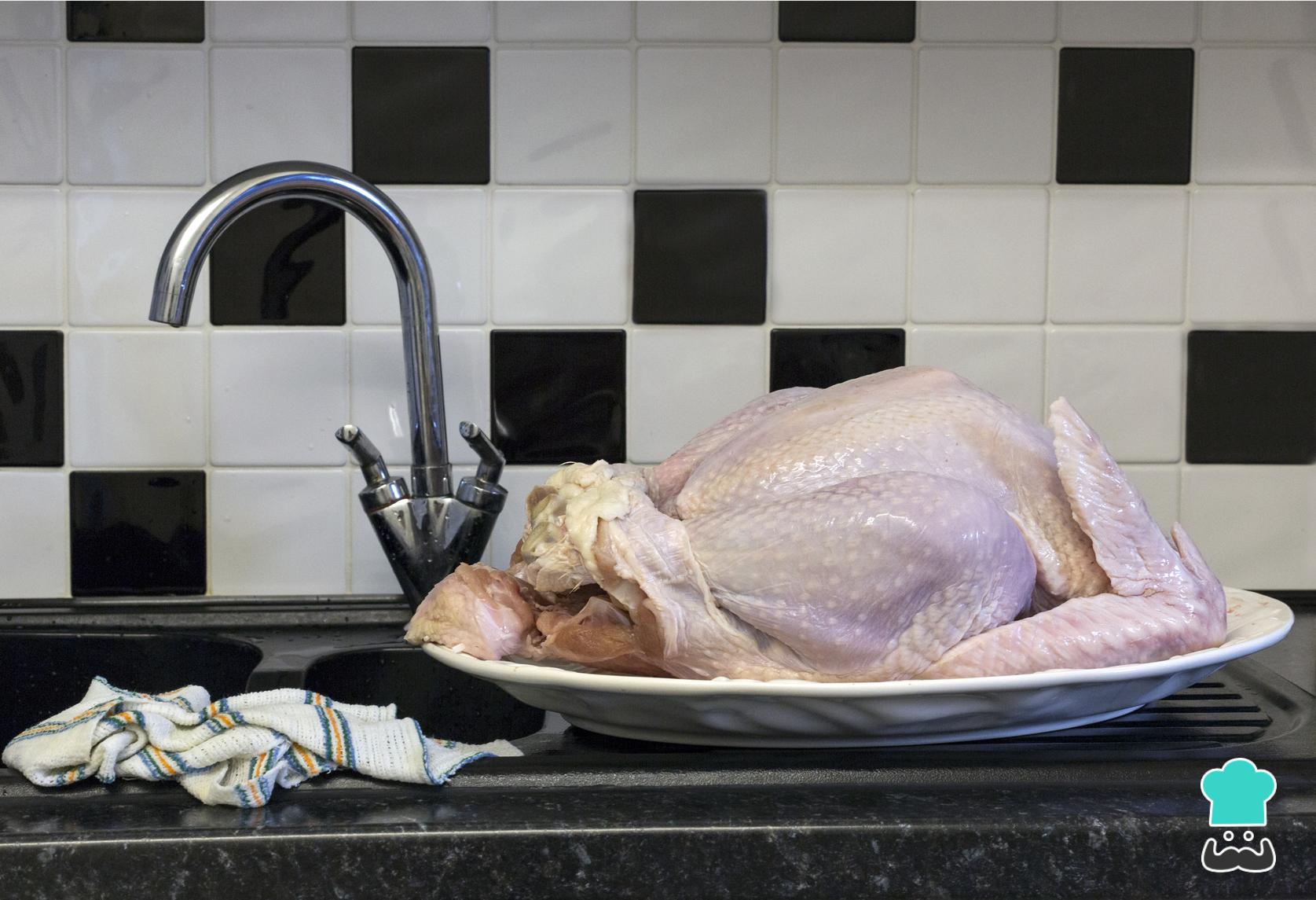 Lo primero que debes hacer para preparar el pavo relleno para Acción de Gracias es limpiar el pavo y retirar las tripas la noche anterior. Pon el pavo debajo del grifo del agua para terminar de limpiar todos los restos que queden en su interior. Tira un chorro de vino blanco encima del pavo y déjalo en el frigorífico durante toda la noche.