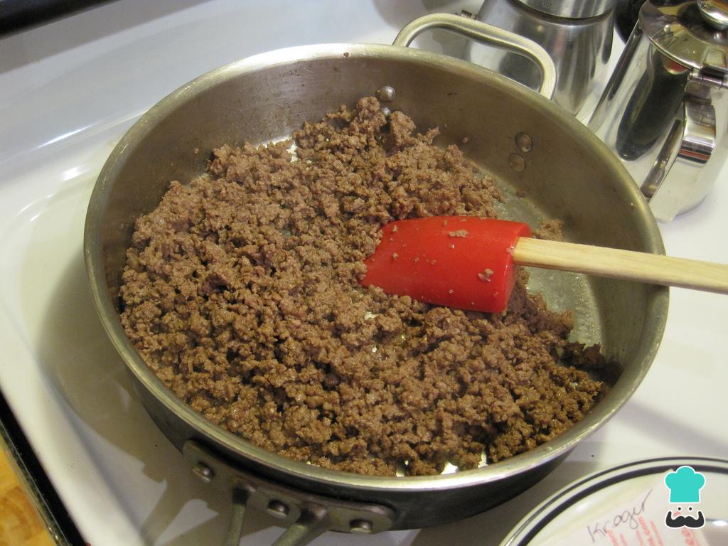 Una vez que el ajo esté dorado, añade la carne molida, cocínala hasta que esté bien frita y seca para realizar el relleno para pavo. Luego, incorpora la pimienta, el tomate, las aceitunas, las alcaparras, las uvas pasas, las almendras y deja que se sazone bien durante 10 minutos para poder continuar con la receta de pavo relleno.