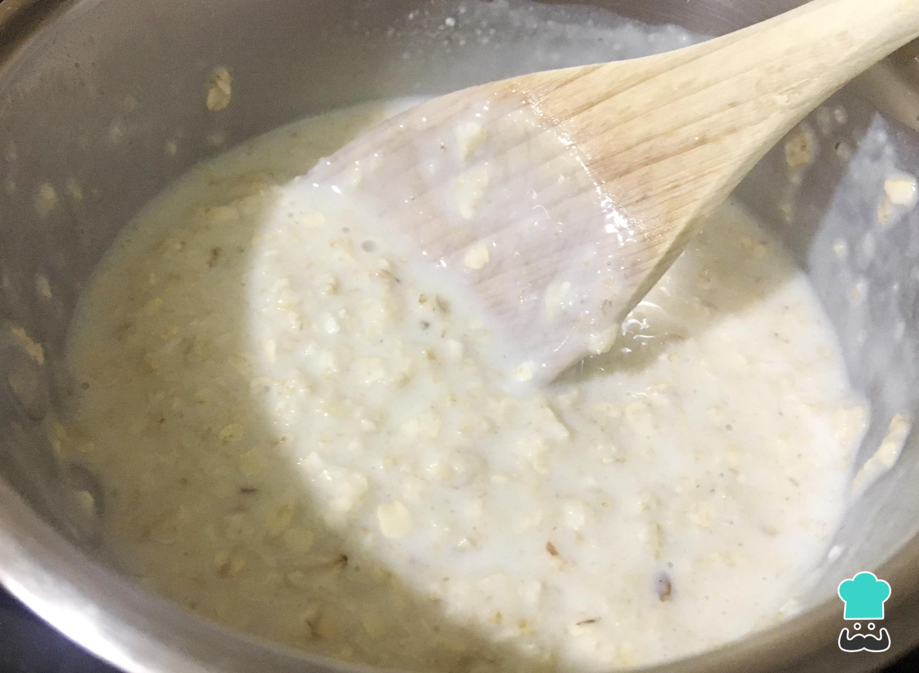 Pon a calentar la leche en un cazo a fuego medio y, cuando esté caliente, añade la avena en copos.