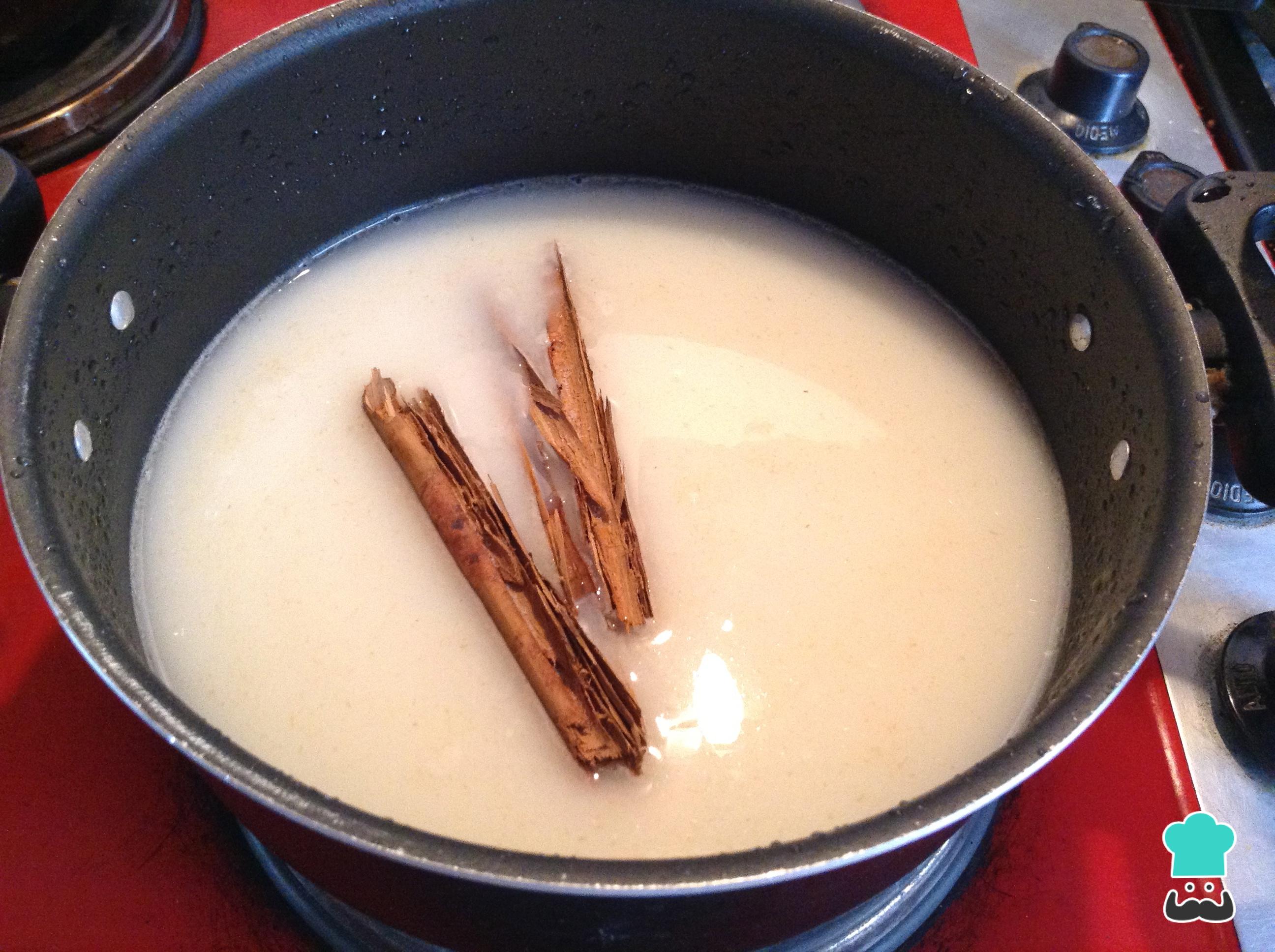 Llevar a fuego medio, agregar la leche entera, las astillas de canela y 1 cucharadita de esencia de vainilla. Dejar cocinar durante 5 a 10 minutos aproximadamente una vez veamos que esta espeso apagar el fuego y dejar enfriar.