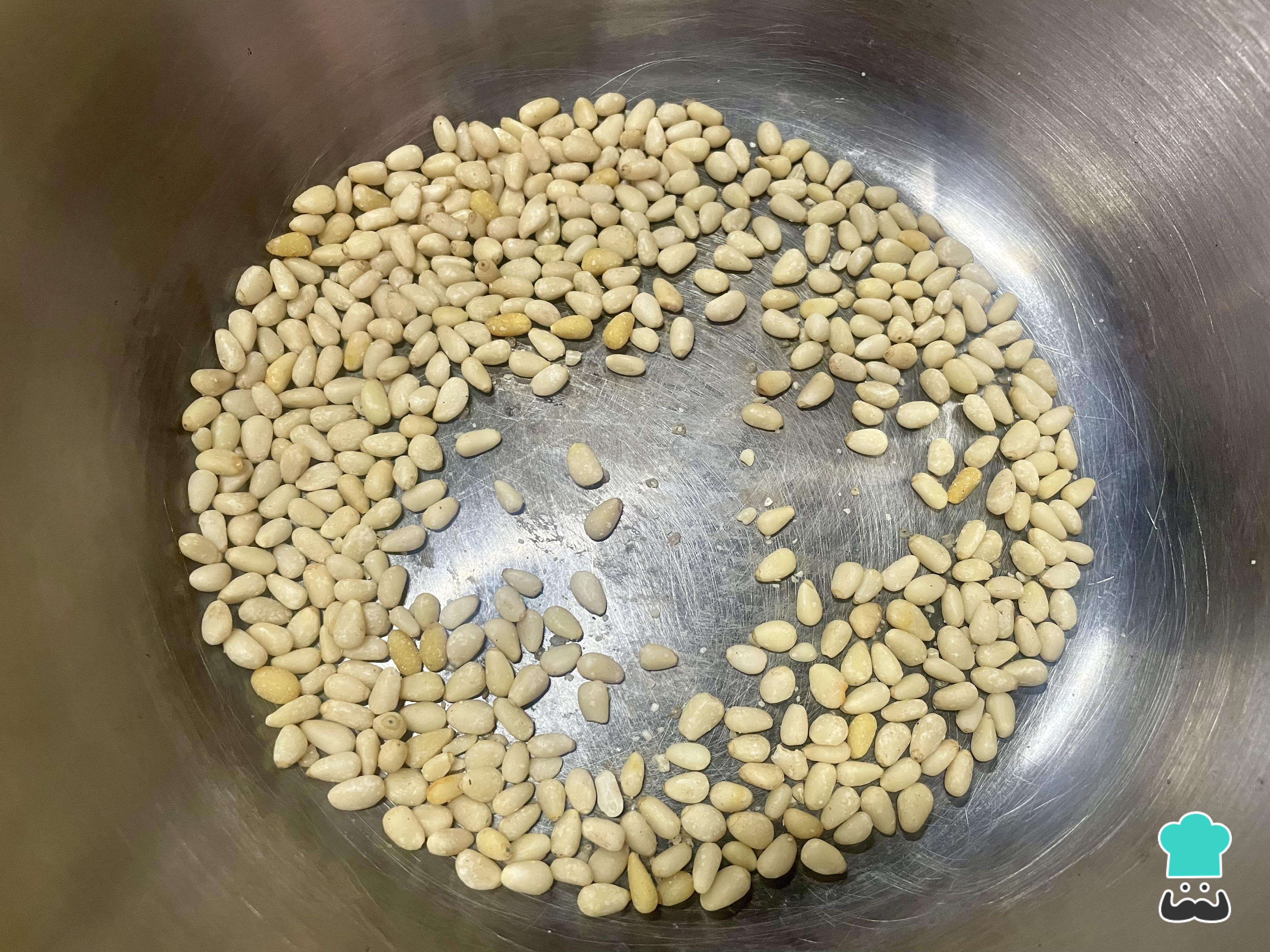 Coloca los piñones en una sartén sin aceite y tuéstalos a fuego medio,removiendo con cuidado para que no se quemen. Retíralos y resérvalos.