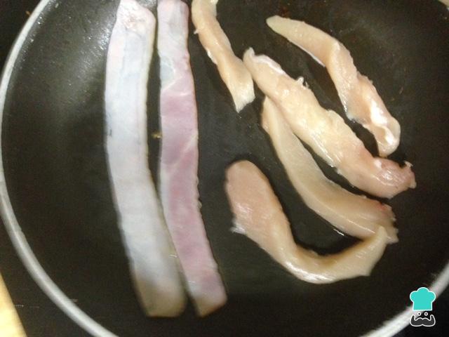 En una sartén ponemos un poquito de aceite de oliva y salteamos el bacon y la pechuga de pollo. Ponemos un poquito de sal en la pechuga y dejamos que se cocine y se dore.