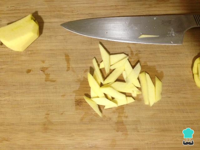 Por otro lado, pelamos la manzana y la cortamos en bastoncitos finos, tal y como indicamos en la foto.