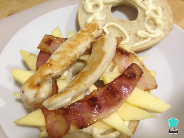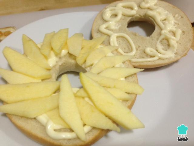 Montamos el bagel de pollo colocando los trozos de manzana en una de las rebanadas y en la otra ponemos mayonesa al gusto.