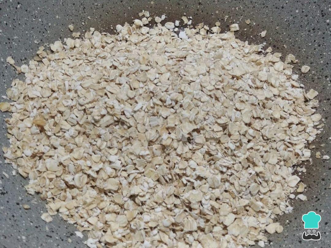 Calienta una sartén y tuesta los copos de avena durante 3-4 minutos removiendo continuamente para que no se quemen.