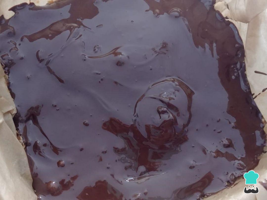 Derrite el chocolate en el microondas o al baño María y viértelo encima de la base de las barritas. Deja enfriar 10-15 minutos.