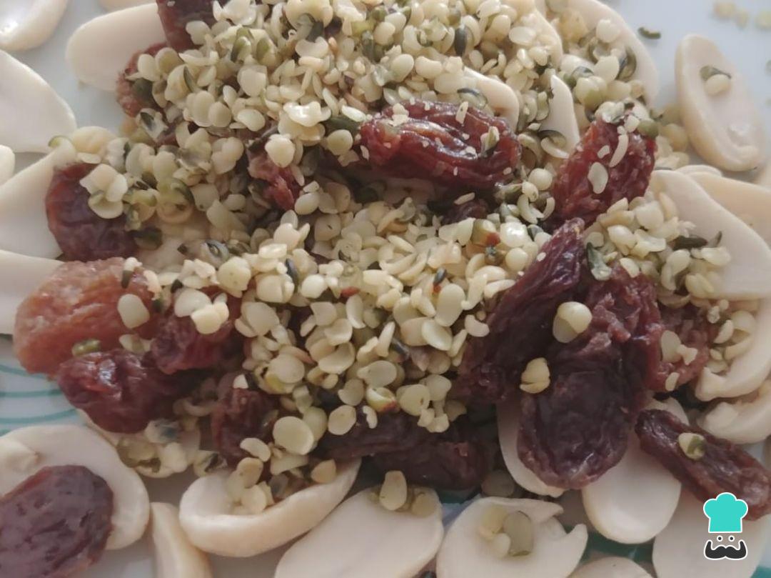 Mezcla los cacahuetes, las pasas y las semillas de cáñamo.