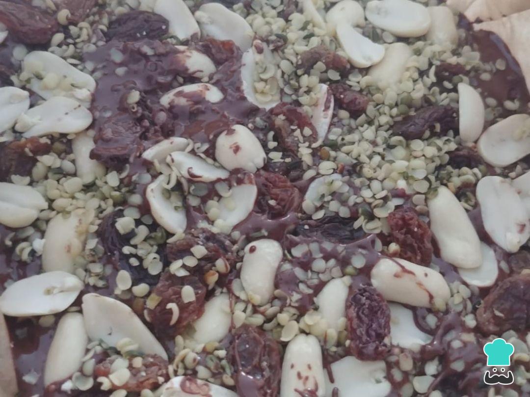 Cuando el chocolate se haya enfriado un poco esparce la mezcla de los frutos secos por encima del molde de las barritas energéticas de chocolate y avena, y vuelve a enfriar hasta que el chocolate endurezca del todo.