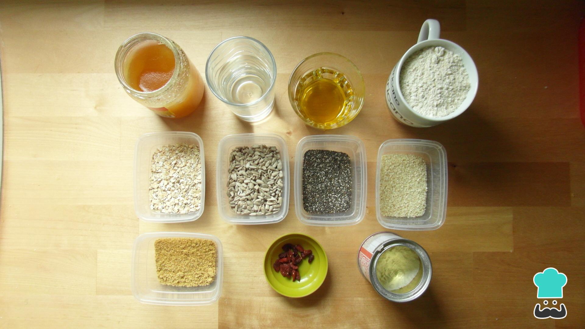El primer paso para preparar estas barritas integrales con semillas es reunir los ingredientes.