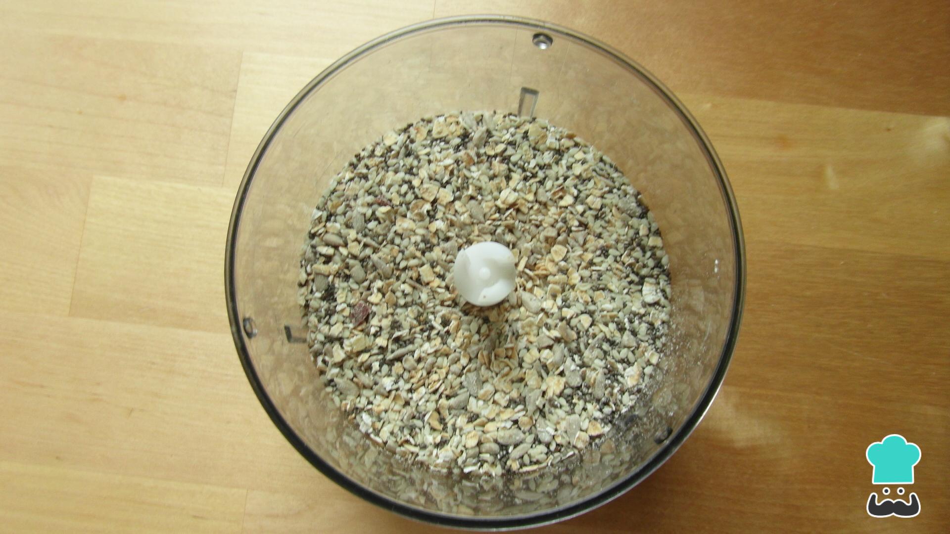 Seguidamente, coloca en una picadora o un procesador de alimentos todas las semillas y los copos de avena, y tritúralo todo ligeramente.