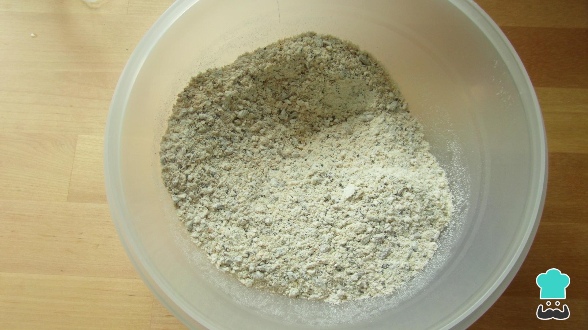 Después pon este preparado en un cuenco y mézclalo con la harina de trigo, la linaza, la levadura y una pizca de sal.