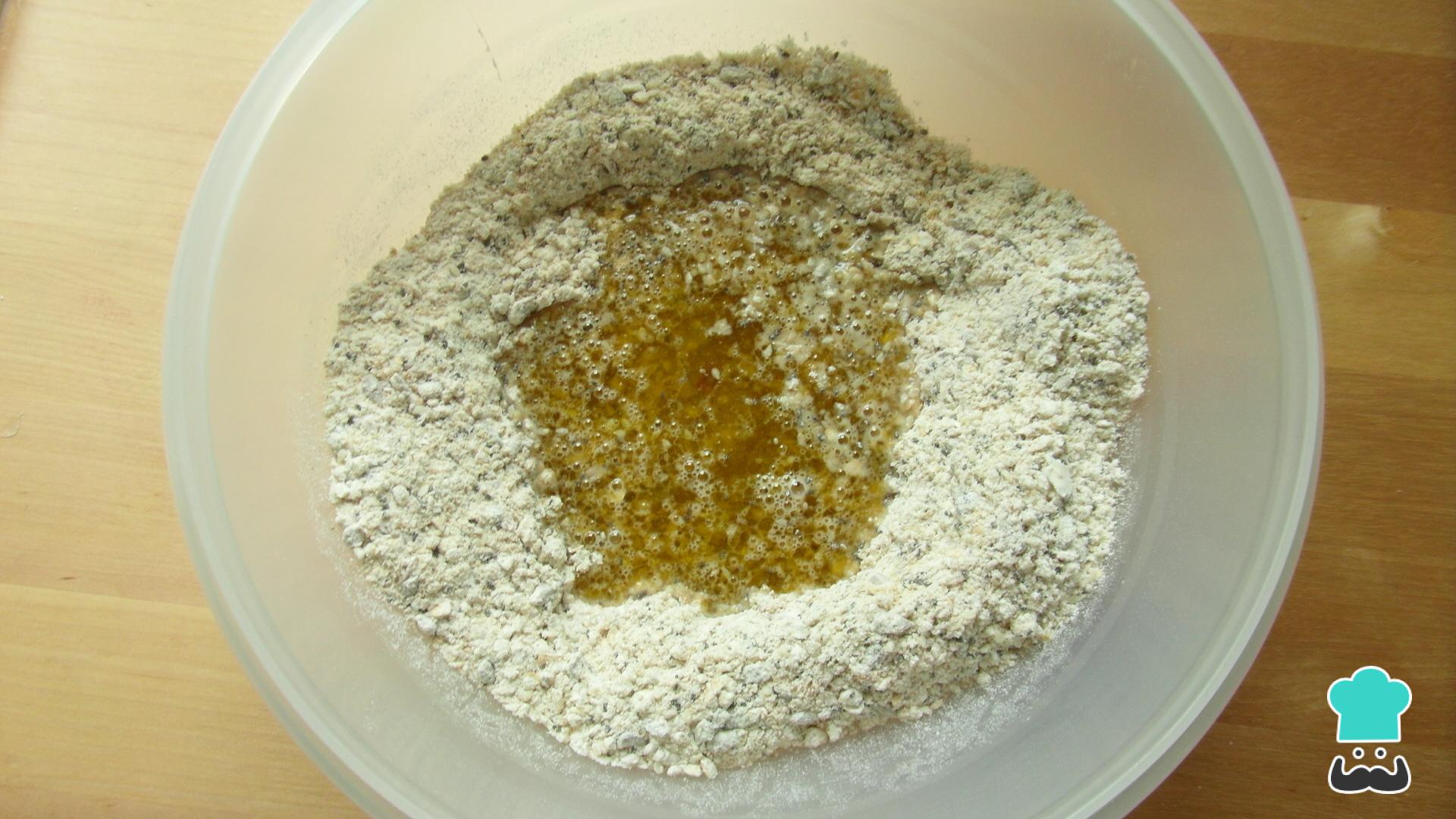 En un recipiente aparte, mezcla el agua, el aceite de oliva y la miel. Luego haz un agujero en el centro del preparado, añade estos líquidos mezclados y vuélvelo a mezclar todo bien.