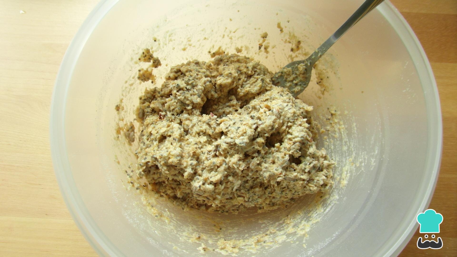 La masa de las barritas integrales con semillas debe tener una apariencia similar a esta imagen.