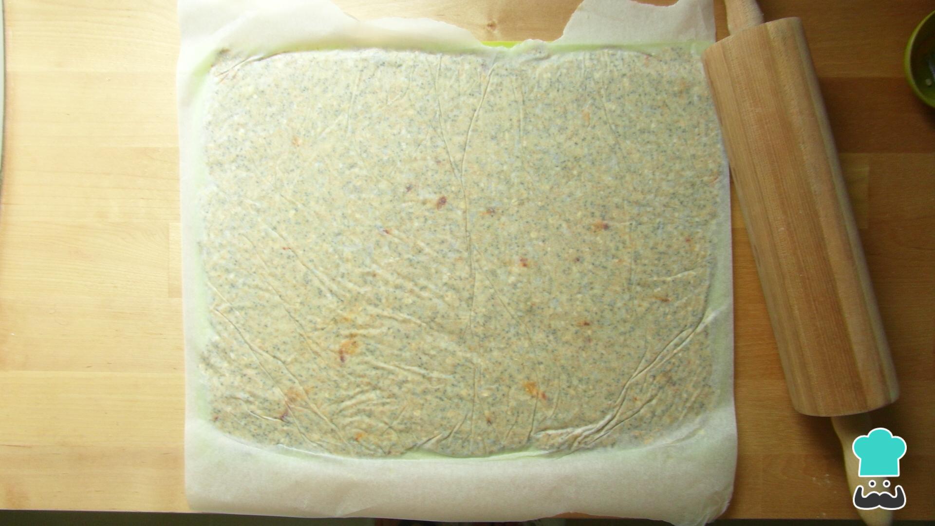 A continuación, transfiere la masa a un silpat o a una hoja de papel sulfurizado, coloca otro silpat u otra hoja de papel de horno encima y, con un rodillo, estira la masa muy bien.