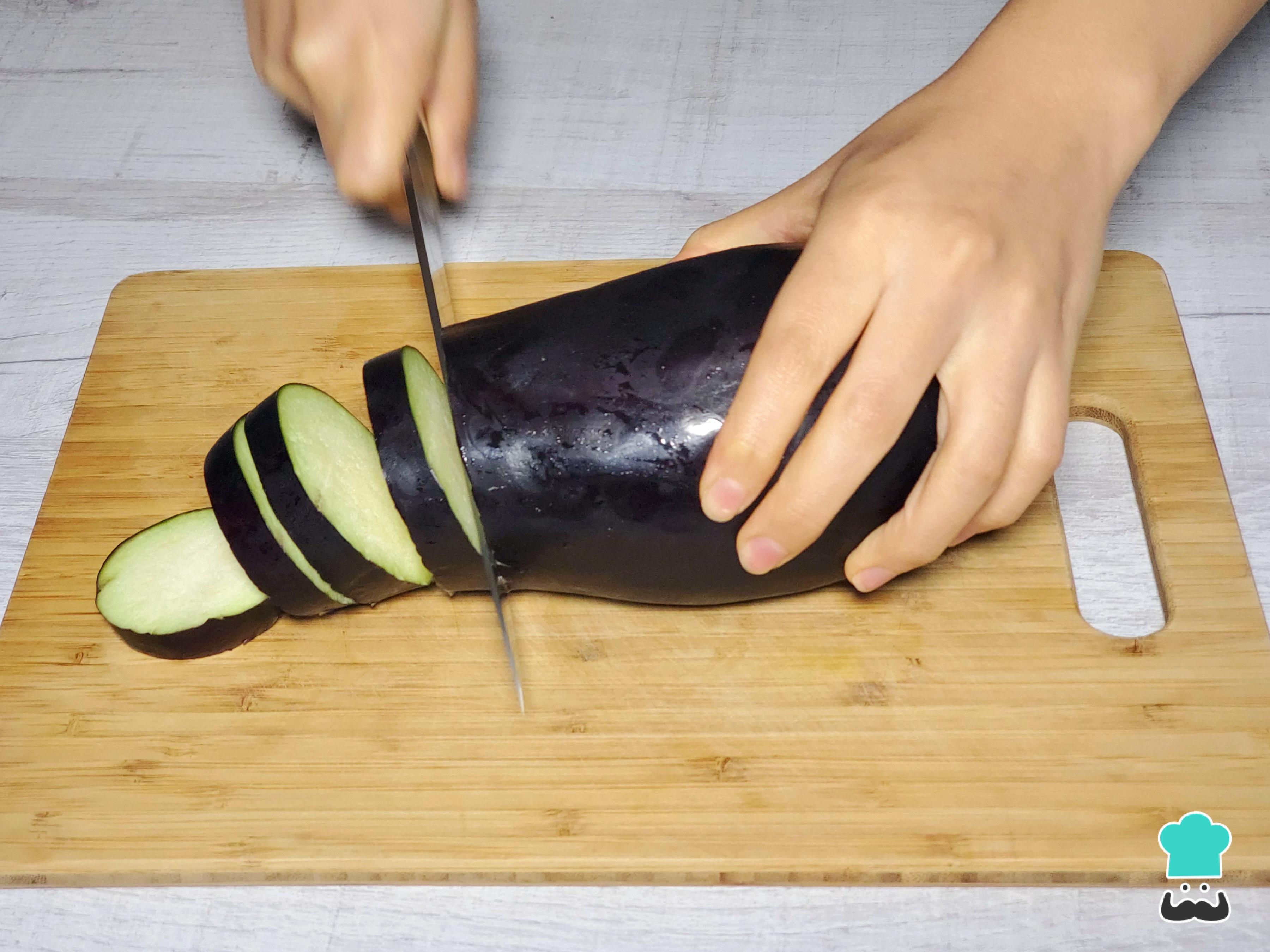 Hacer este encurtido casero es muy sencillo, pero requiere un paso importante: eliminar el amargor natural, y a veces picante, de las berenjenas. Para lograrlo, corta las berenjenas en rodajas y retira los extremos.