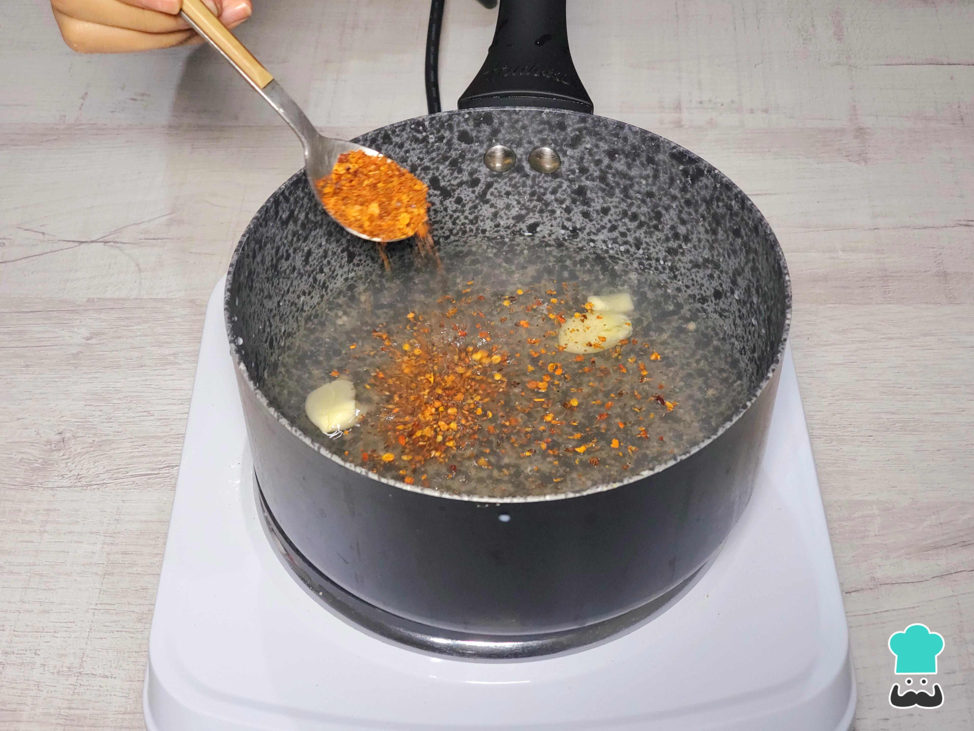 Una vez transcurrido el tiempo, enjuágalas bien y resérvalas. En una olla, combina agua, vinagre, dientes de ajo, laurel, sal, pimienta negra en grano y ají en hojuelas.