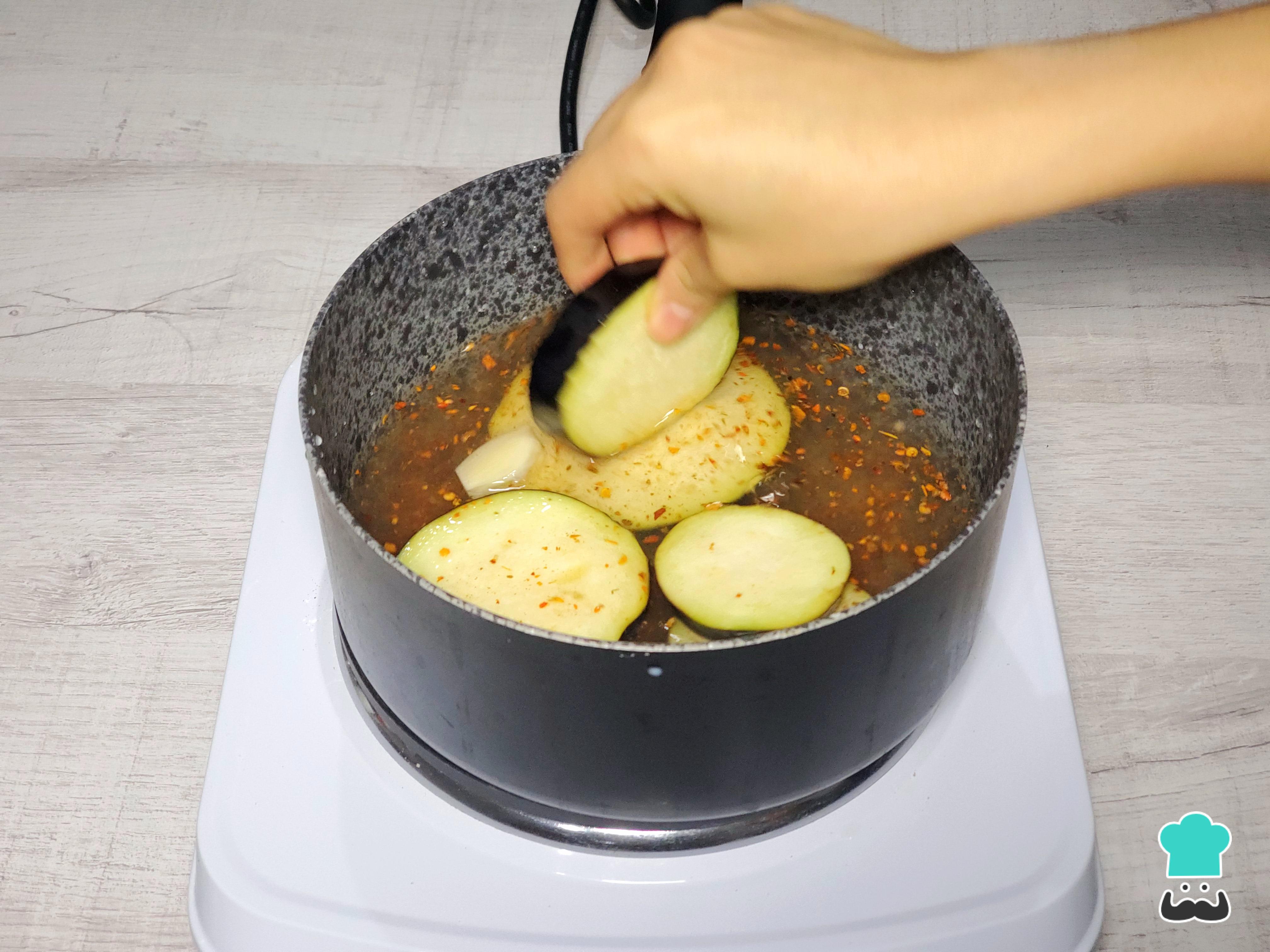 Remueve bien y sumerge las rodajas de berenjena una por una en esta mezcla. Asegúrate de que queden bien cubiertas, volteándolas si es necesario durante la cocción.