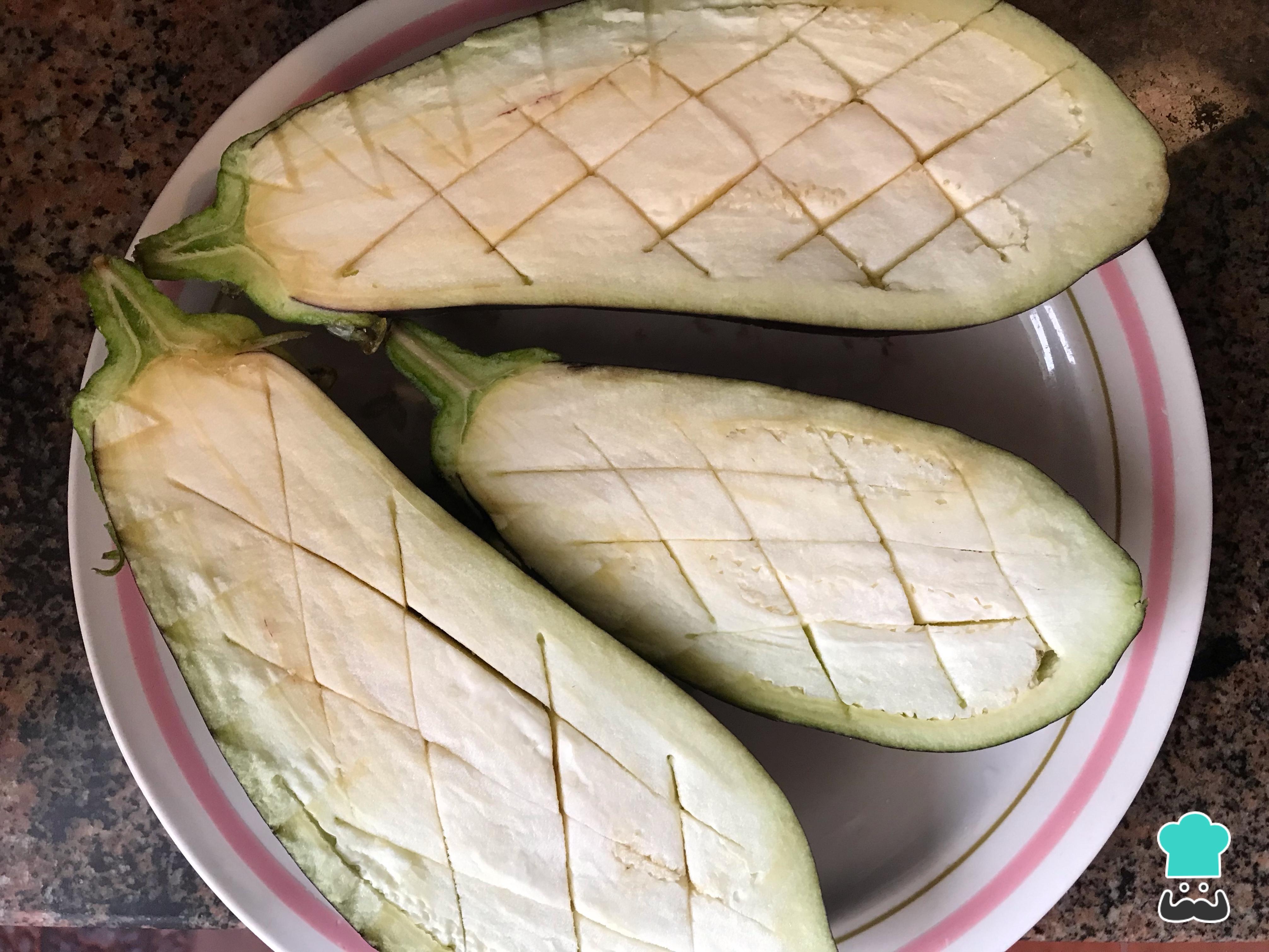 Lava y corta las berenjenas por la mitad a lo largo. Realiza unos cortes en cruz en su pulpa, como ves en la imagen, para que se cocine mejor por dentro. Cocina 3 de las mitades en el microondas durante 10-12 minutos en un recipiente apto y tapado.