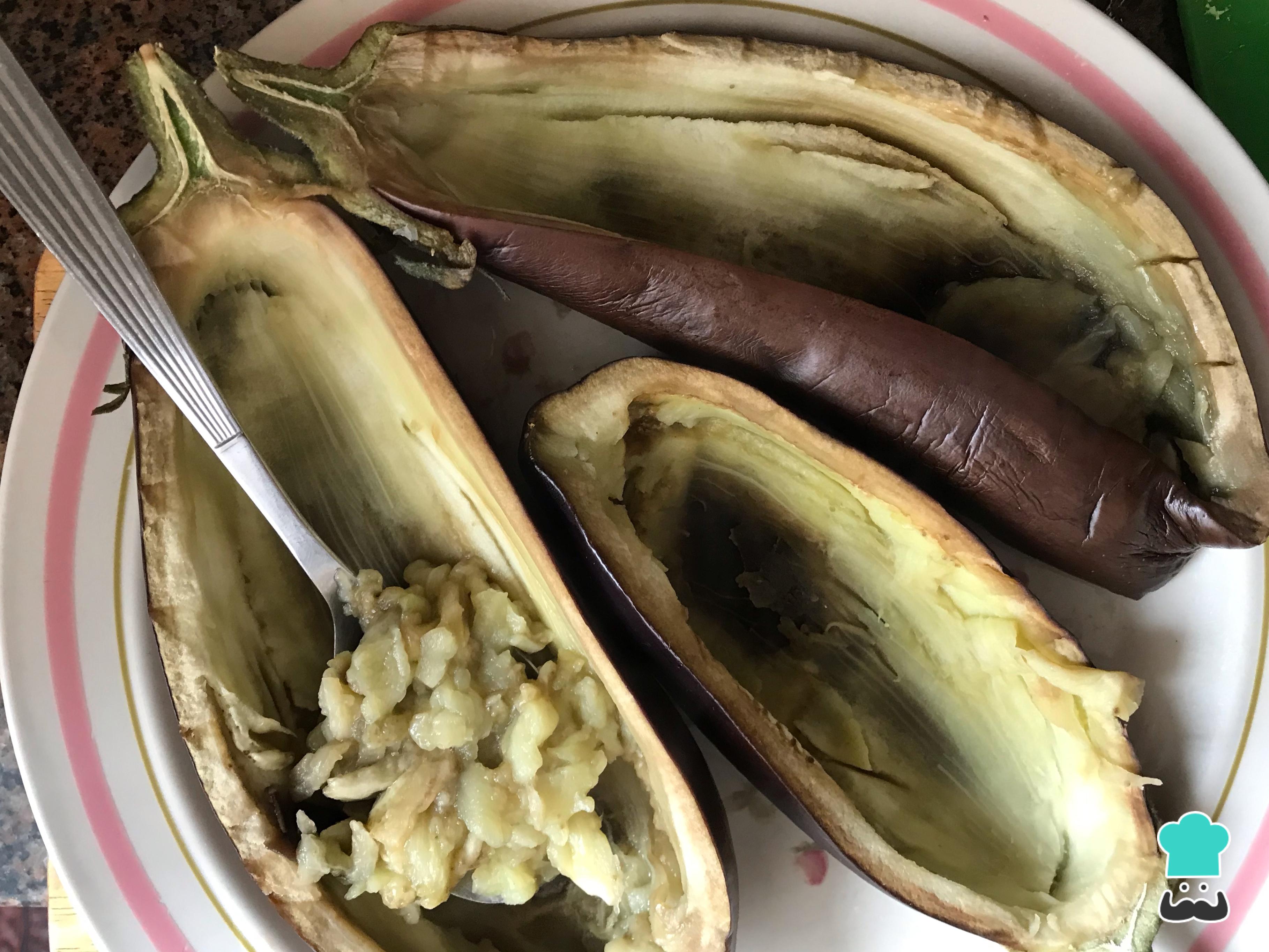 Con cuidado de no quemarte, retira la pulpa de las berenjenas dejando algo de carne cerca de la cáscara y resérvala.
