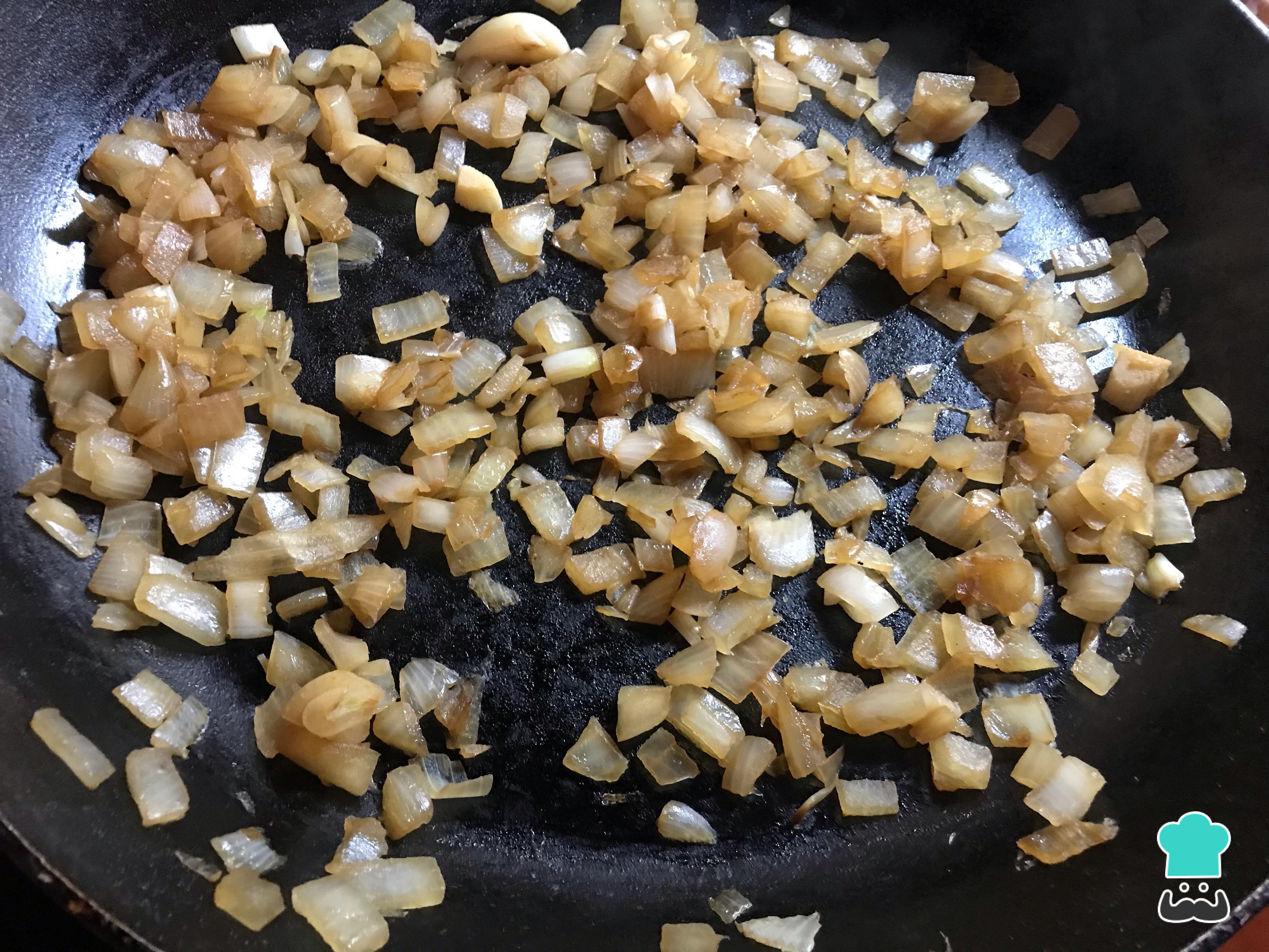 Pica, corta y carameliza la cebolla con sus propios azúcares. Para ello, dórala en una sartén antiadherente con aceite en aerosol (o un chorrito) a fuego medio. Agrega 1 cucharada de agua y revuelve esporádicamente hasta que se evapore. Repite este procedimiento tantas veces como quieras hasta obtener unas cebollas tiernas y bien dulces.