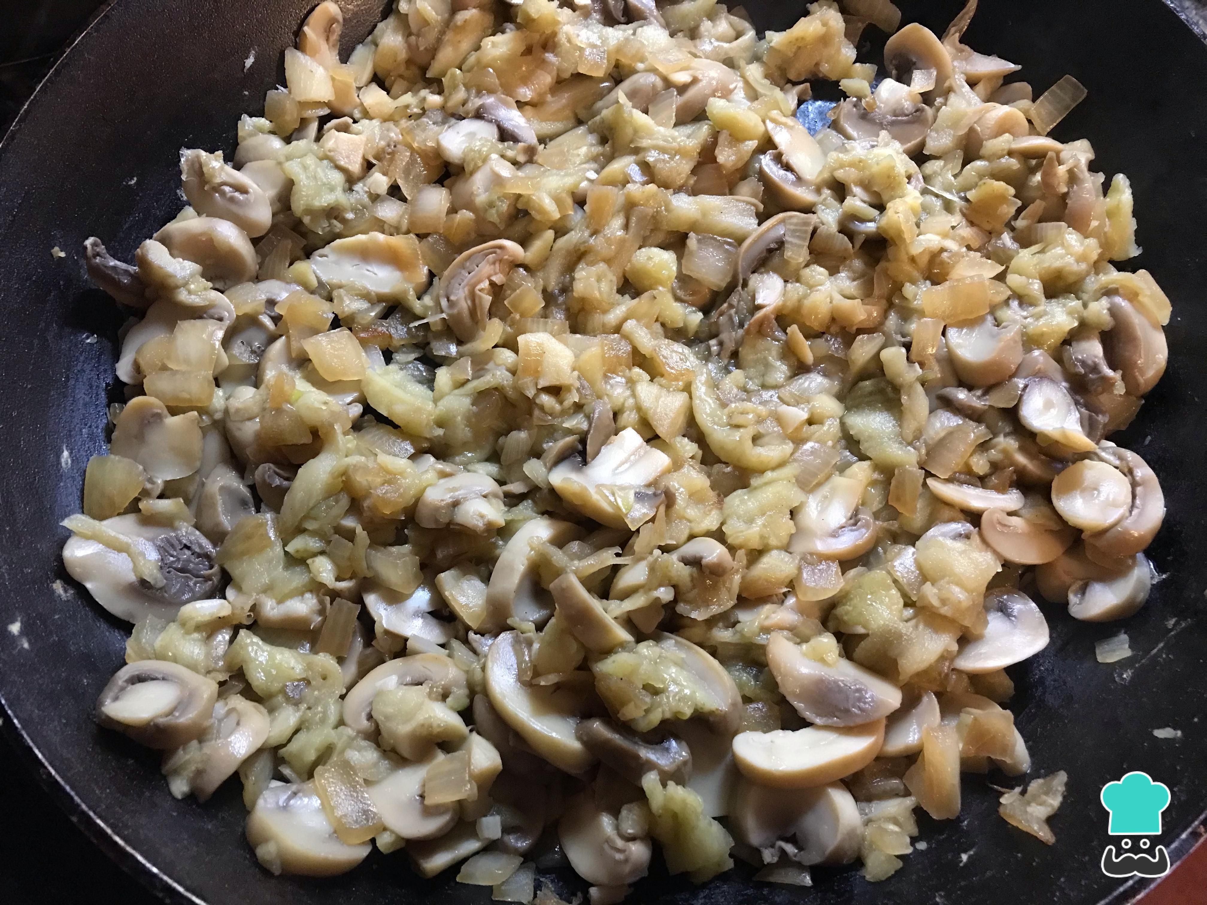 Agrega la pulpa de las berenjenas cocidas y los champiñones. Saltea las verduras por unos minutos y condiméntalas con el pimentón y el tomillo.