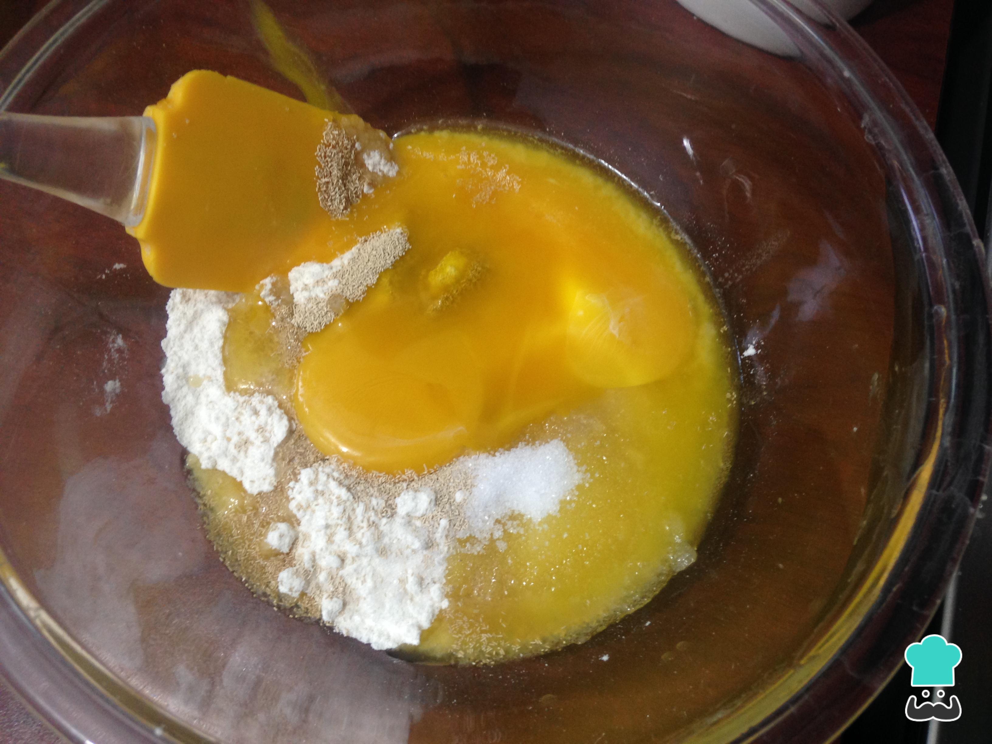 Agrega las yemas de huevo, la mantequilla y el agua, preferiblemente caliente o a temperatura ambiente.