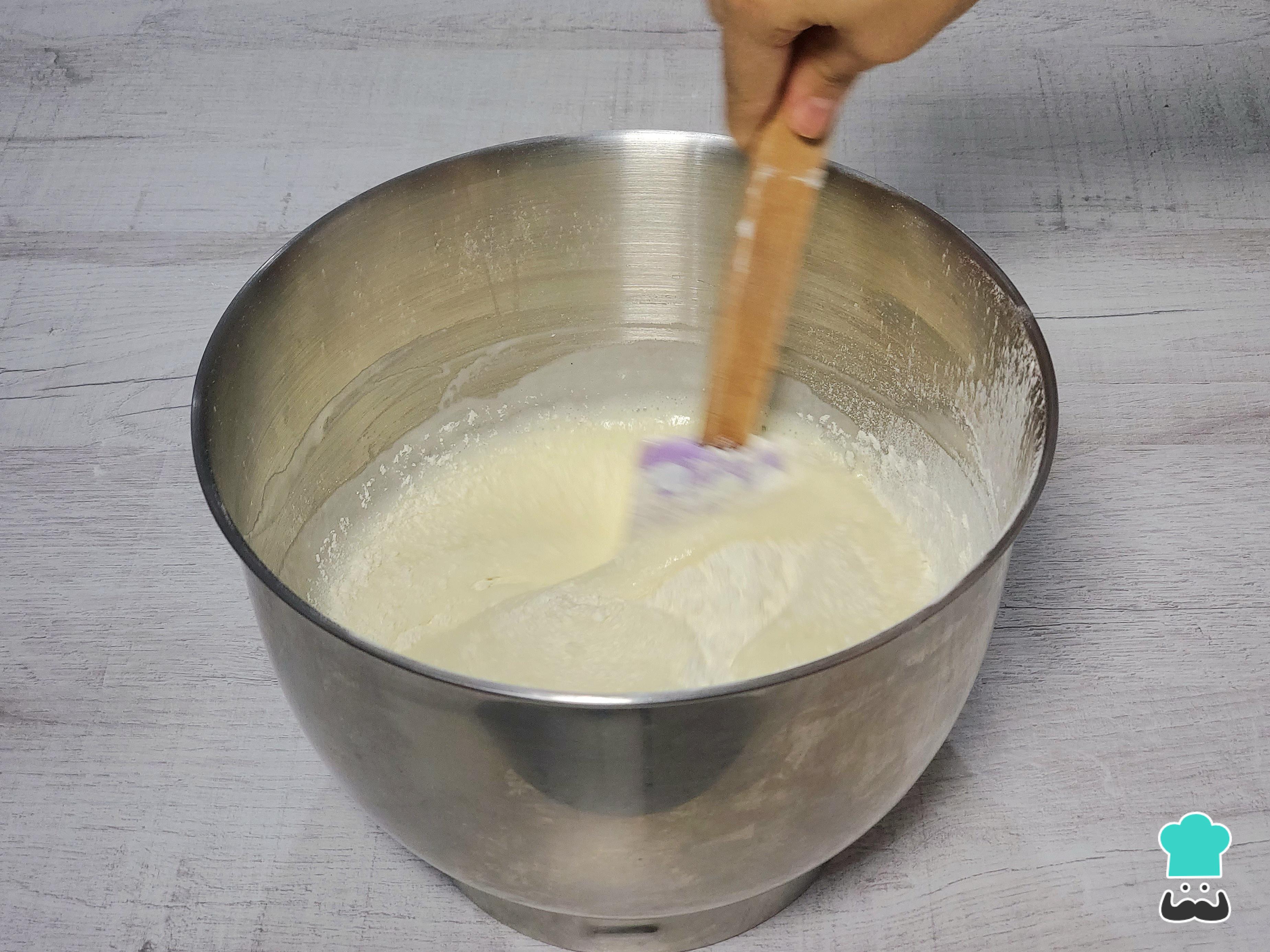 Agrega la mitad de la leche, remueve y continúa con el segundo tercio de los ingredientes secos, añade el resto de la leche y finaliza incorporando el último tercio de los ingredientes secos. Mezcla con movimientos envolventes hasta que la masa esté homogénea y sin grumos visibles.