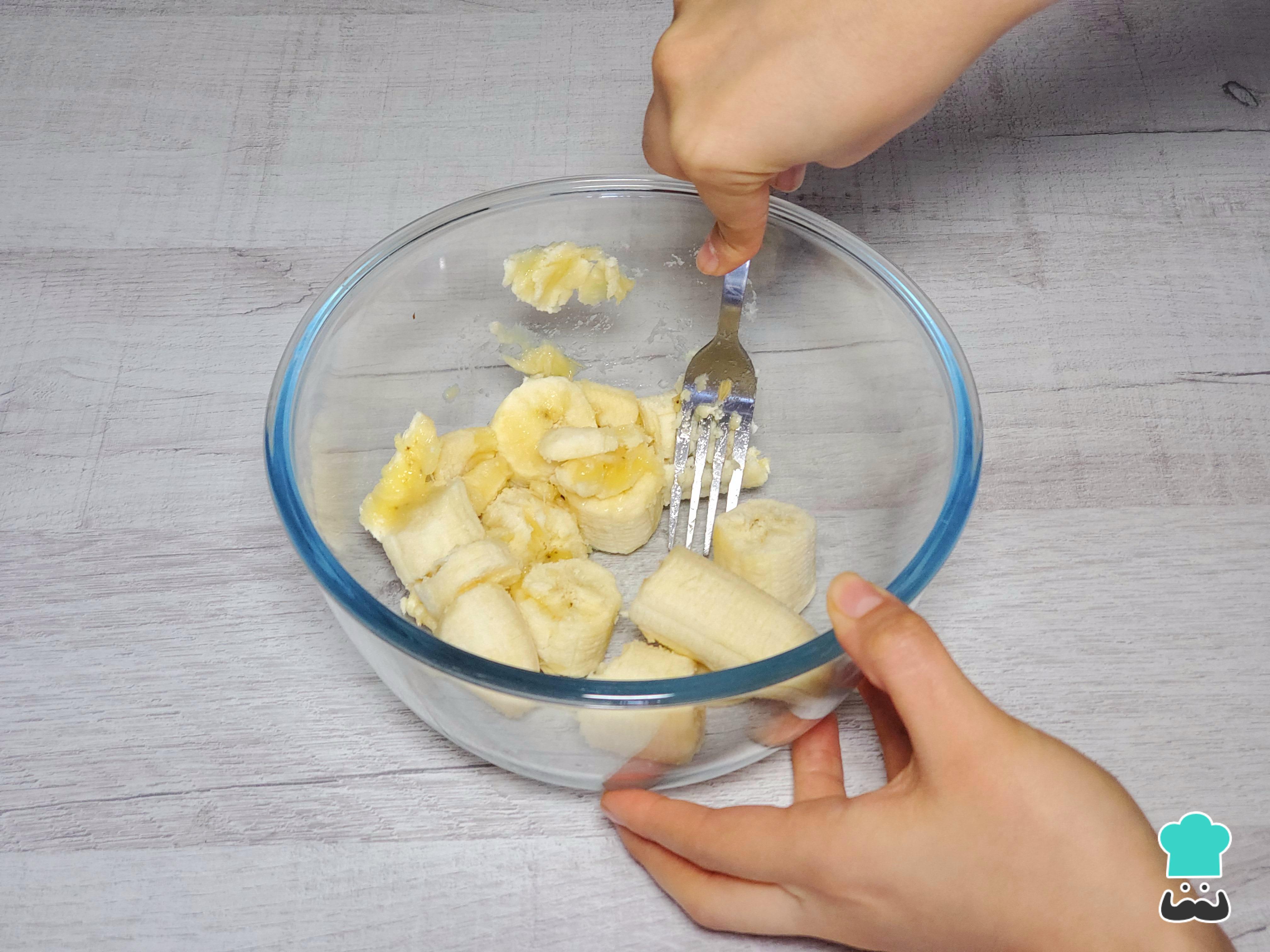 Empieza colocando los plátanos en un bowl, aplástalos con un tenedor hasta hacerlos puré. De preferencia, utiliza plátanos mosqueados, es decir, que hayan pasado el punto de maduración, ya que estarán más dulces. Esto es importante porque es el ingrediente que aportará mayor dulzor al bizcocho o pan de plátano.