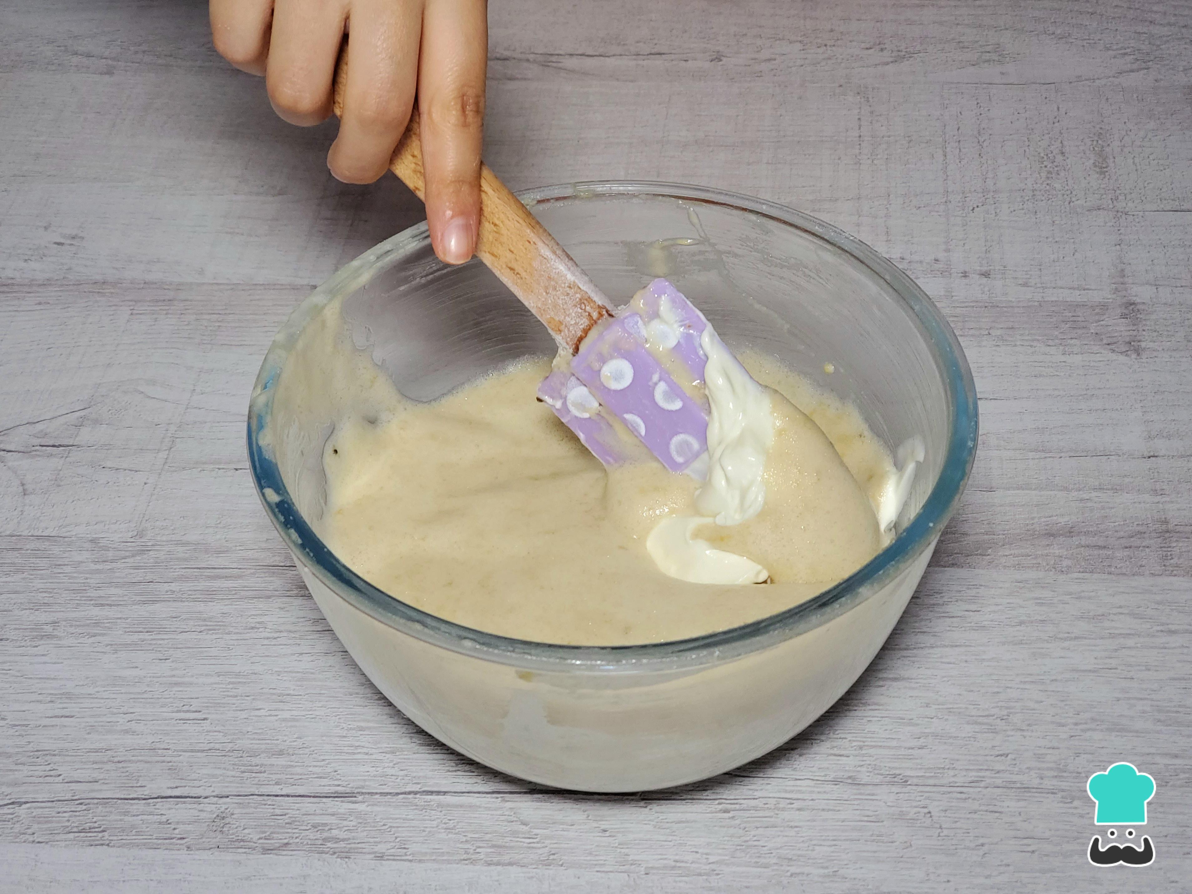 Encima de esta espuma, incorpora el yogur (que debe estar a temperatura ambiente) y remueve con una espátula de goma, haciendo movimientos envolventes. Así mantenemos la estructura aireada que se formó durante el batido de los huevos.