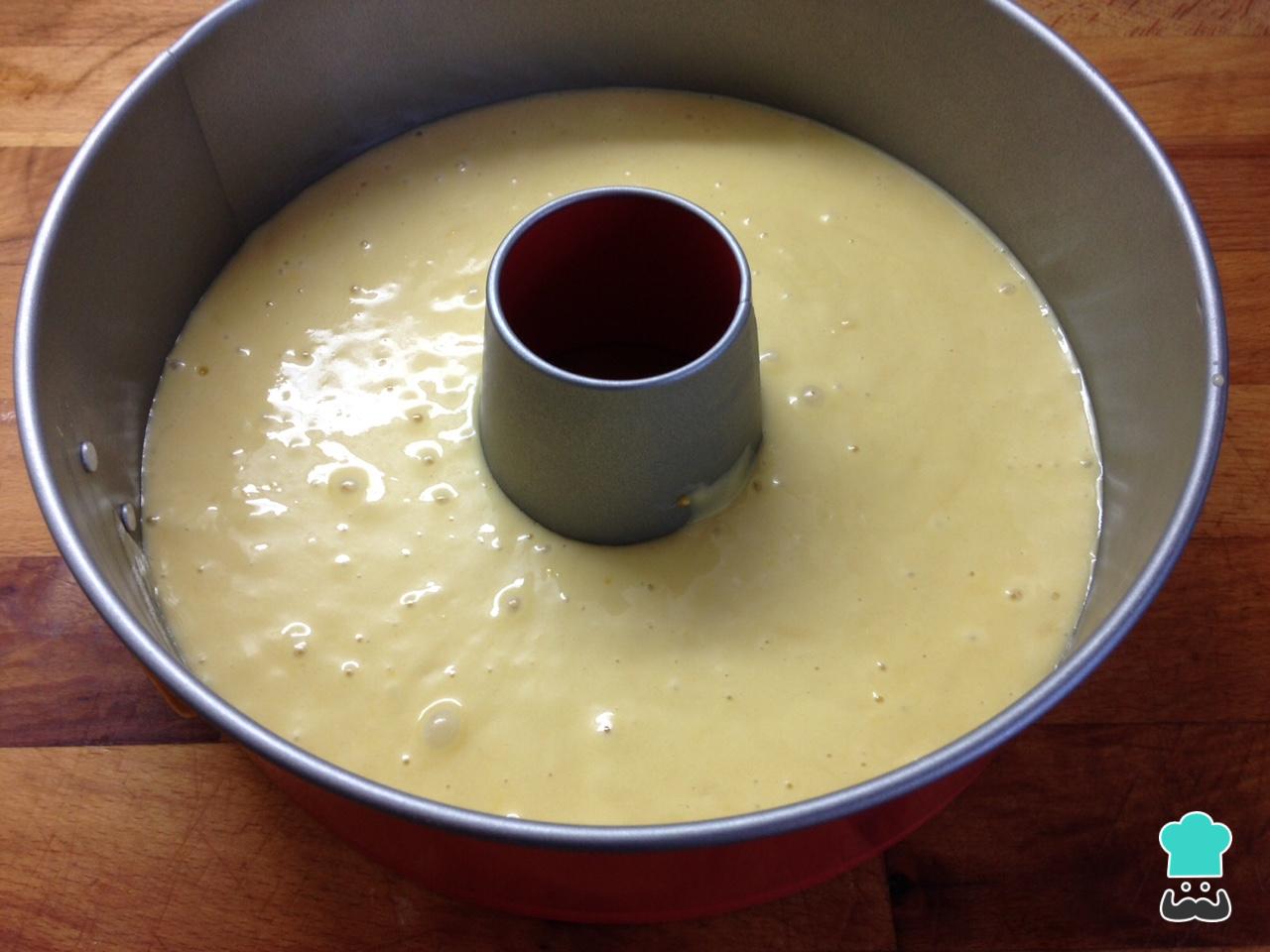 Vierte la masaen un molde de 20 cm de diámetro aproximadamente de silicona o de metal, pero entonces tendrás que engrasarlo con un poquito de aceite y enharinarlo con maicena o un poco más de harina sin gluten para que el bizcocho para celíacos se desmolde fácilmente una vez horneado y enfriado.