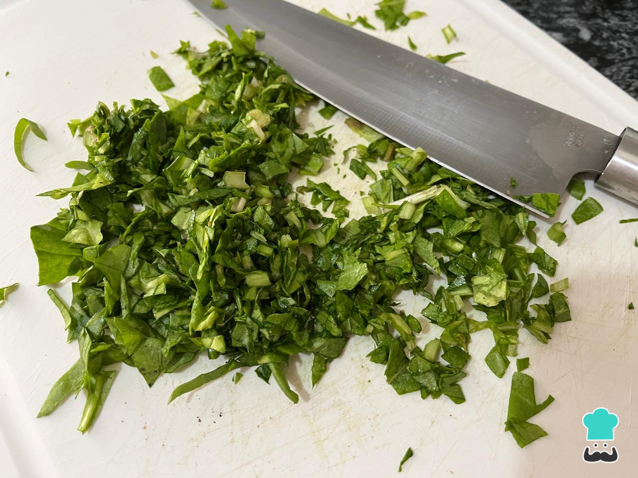 Para empezar con la preparación de los bocadillos de acelga pica las hojas en crudo. Para limpiarlas deberás sumergirlas unos 15 minutos en una solución de agua con lavandina, agregando una gota de lavandina apta para alimentos por litro de agua.
