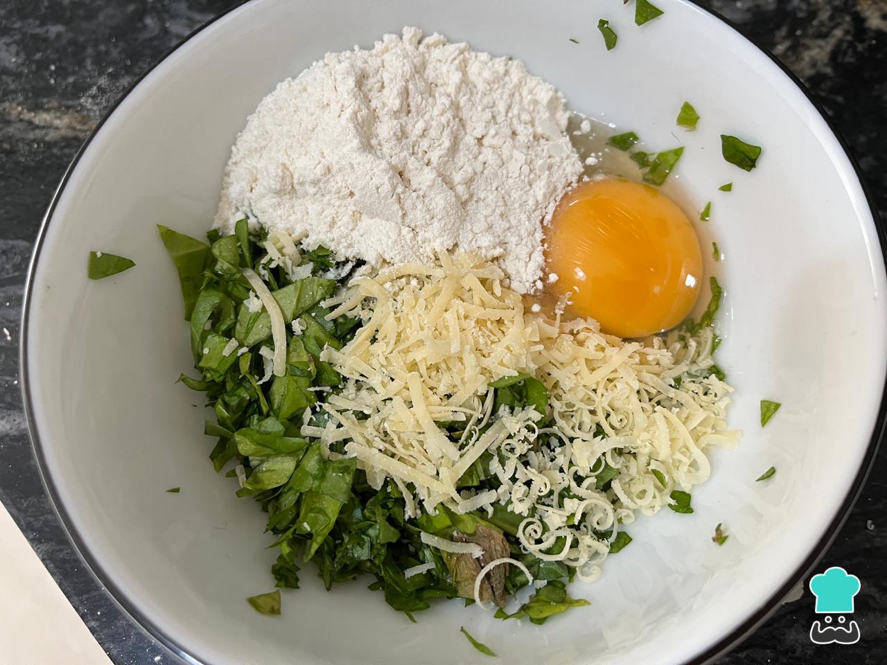 Mezcla las hojas con el huevo, el queso rallado, los condimentos al gusto y la harina de a poco hasta formar una masa. Usamos la acelga en crudo para no tener doble cocción y perder más nutrientes. Podrá cambiar ligeramente la cantidad de harina, de acuerdo al tamaño de huevo que utilices.