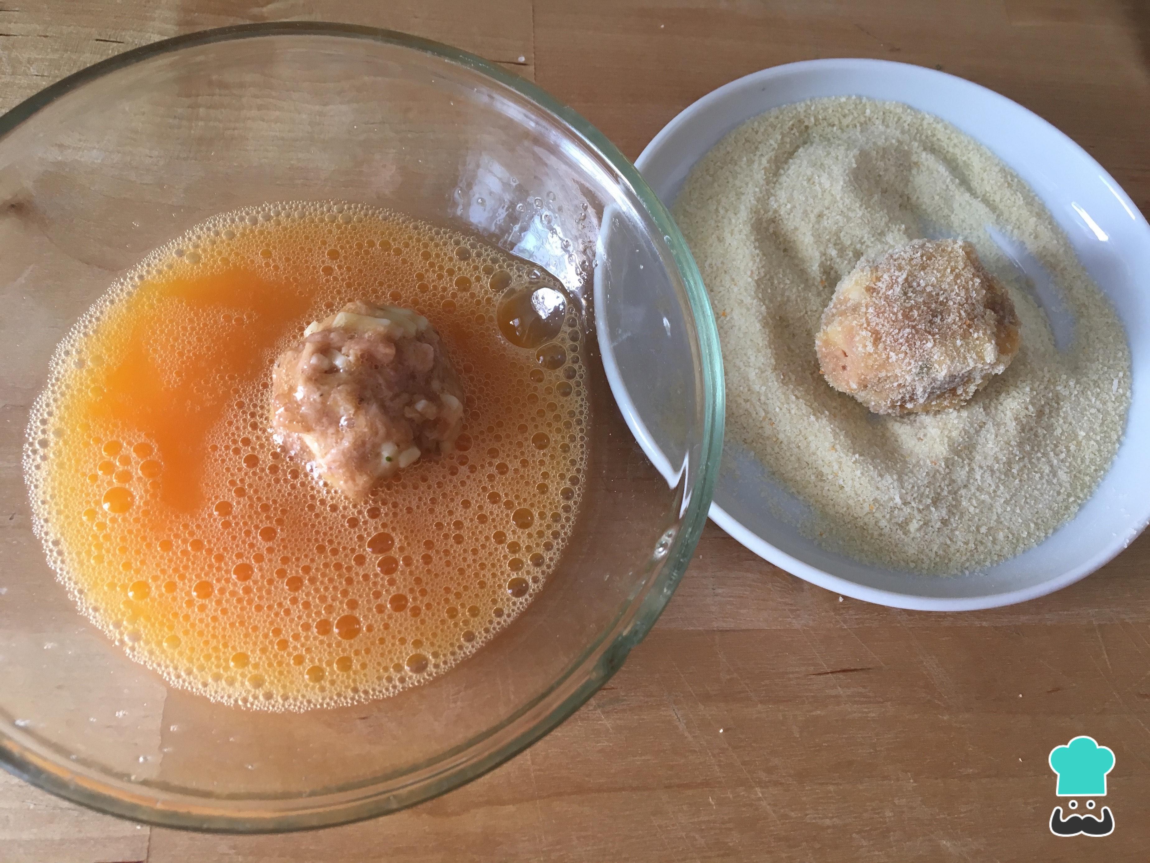 Rebozamos las bolitas de atún pasándolas por el huevo batido y el pan rallado hasta acabar con todas.