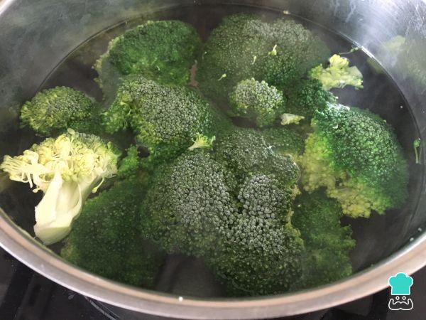 Coloca una olla con abundante agua y una pizca de sal al fuego y llévala a ebullición. Cuando hierva cuece el brócoli en ramilletes durante unos 5-6 minutos y luego escúrrelo bien.