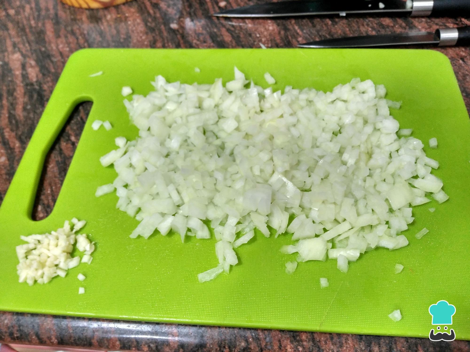 Mientras tanto, pica la cebolla y los ajos y empieza a pocharlos en una sartén con el aceite de oliva.