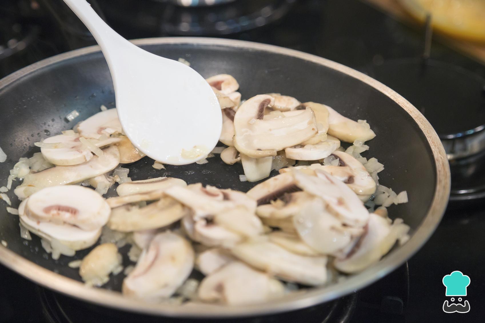 Al mismo tiempo, lamina los champiñones frescos lavándolos muy bien previamente y añádelos a la sartén cuando la cebolla empiece a dorarse.