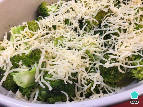 Vierte la mezcla en una bandeja o fuente apta para horno y espolvorea el queso rallado al gusto por encima del gratén de brócoli y champiñones.