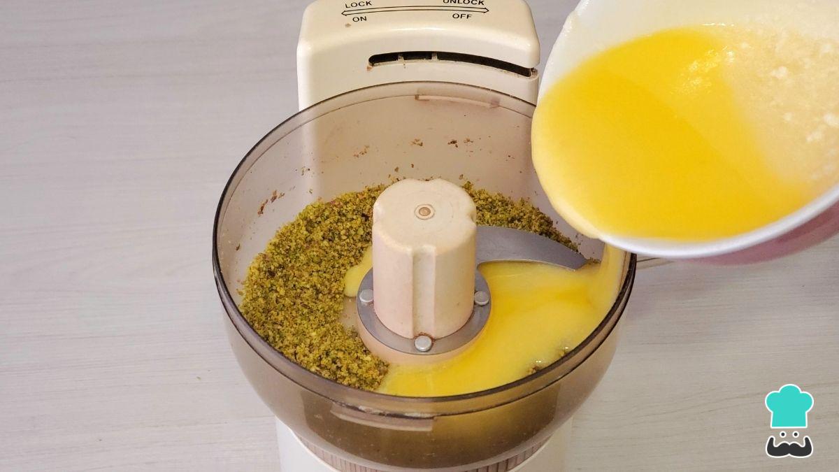 Vierte esta mezcla en el procesador junto con los pistachos y tritura hasta que se forme una crema homogénea.