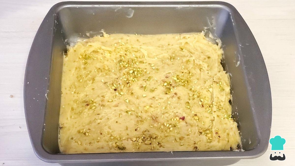 Encima puedes esparcir más pistachos finamente picados y hornear a 180 °C durante 30 minutos. Se cocina a alta temperatura para dorar la superficie y la base, manteniendo el centro suave.