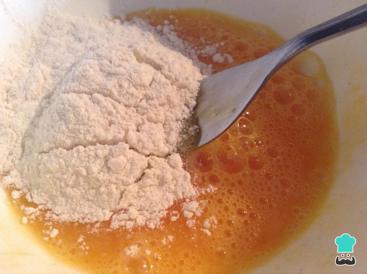 Añade la harina de trigo y el polvo para hornear a la mezcla con huevo.